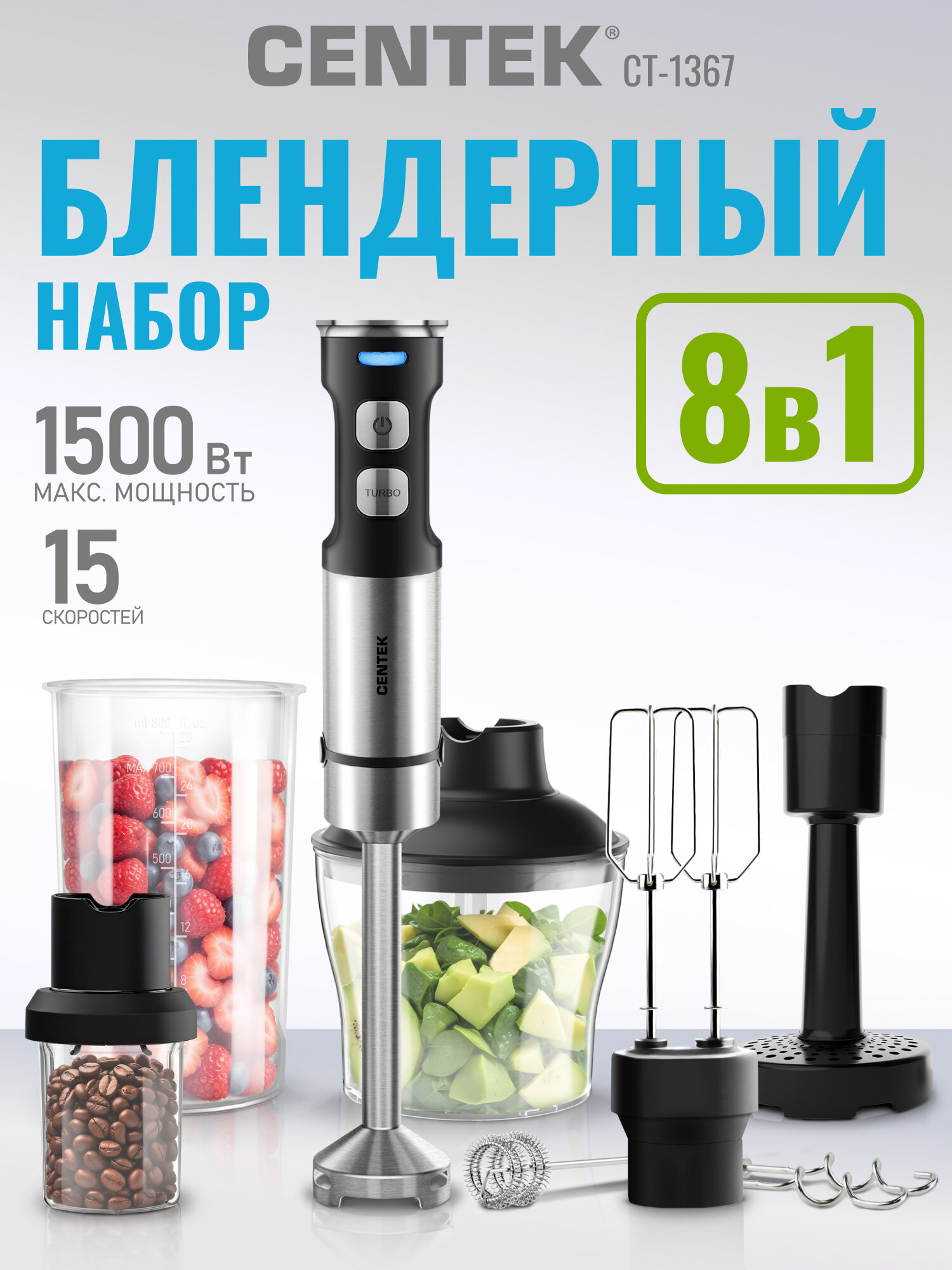 Блендер Centek CT-1367 (сталь) 1500Вт, 8в1, блендер/венчик/чоппер/кофе, дисплей 650мл стакан 800мл: сравнение цен, характеристики, фото, актуальное наличие и цены.