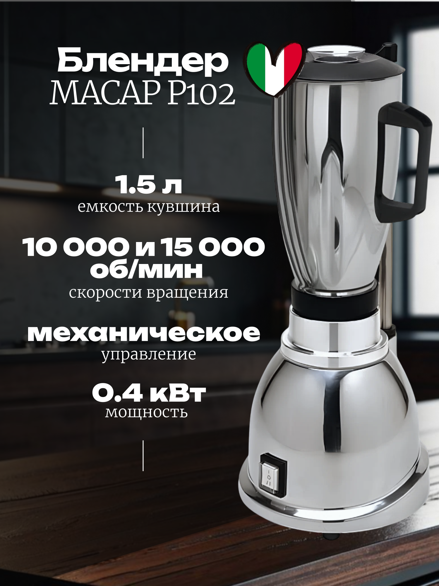 Блендер MACAP P102, 1,5 л, 200х200х460 мм, 0,4 кВт, 220 В, нержавеющая сталь
