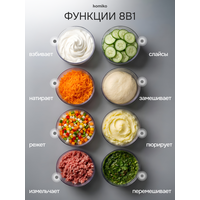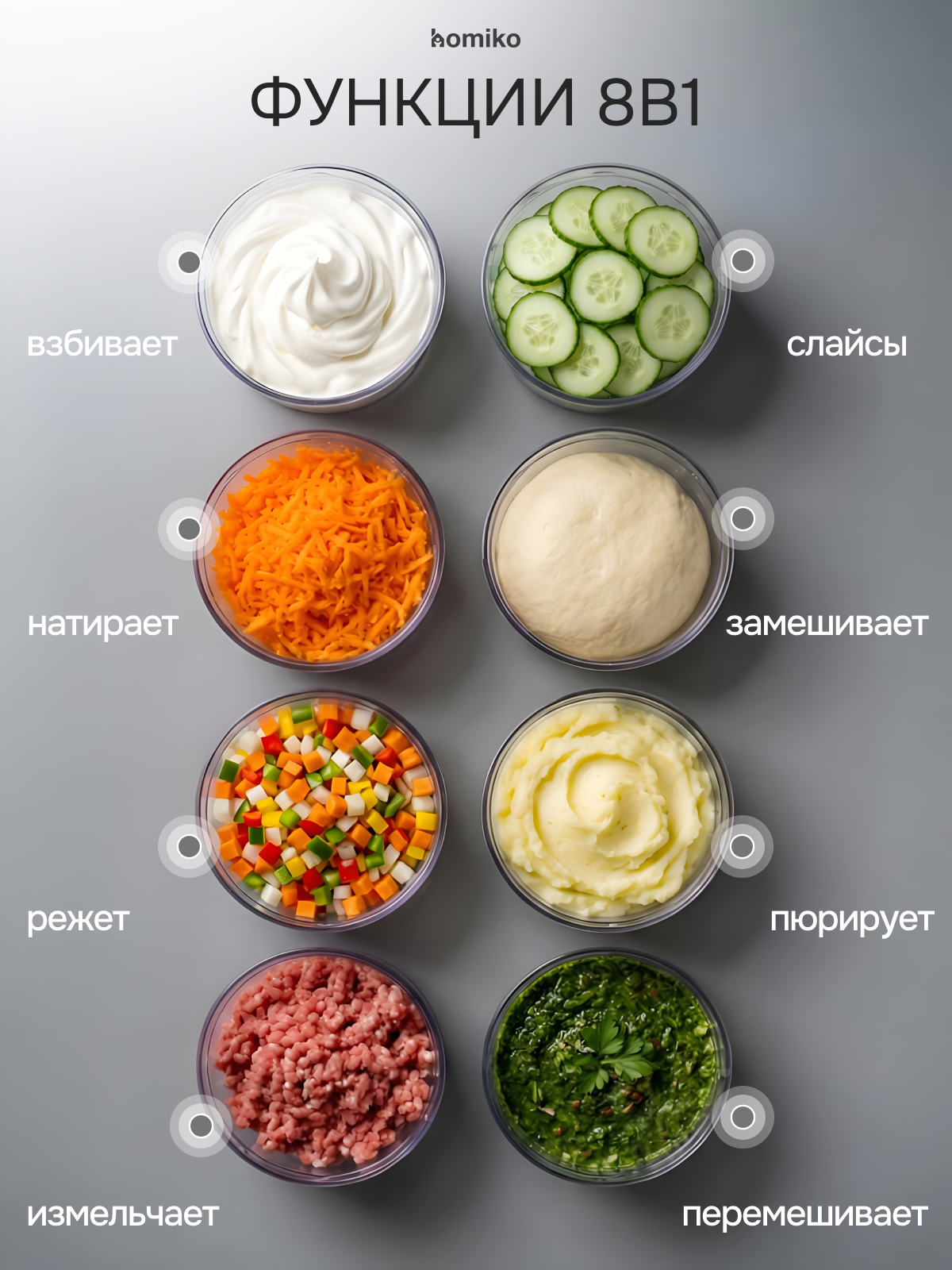 Многофункциональность — измельчение, взбивание, смешивание, нарезка, шинковка, замешивание теста.