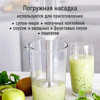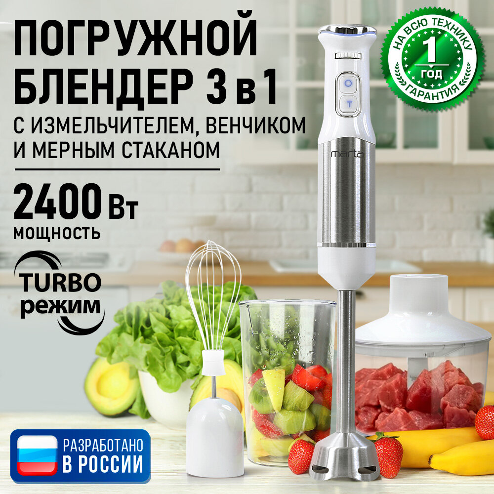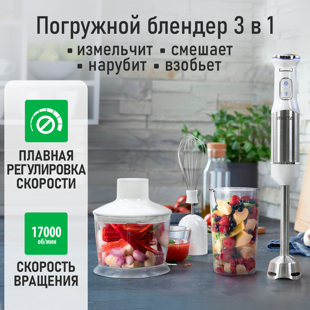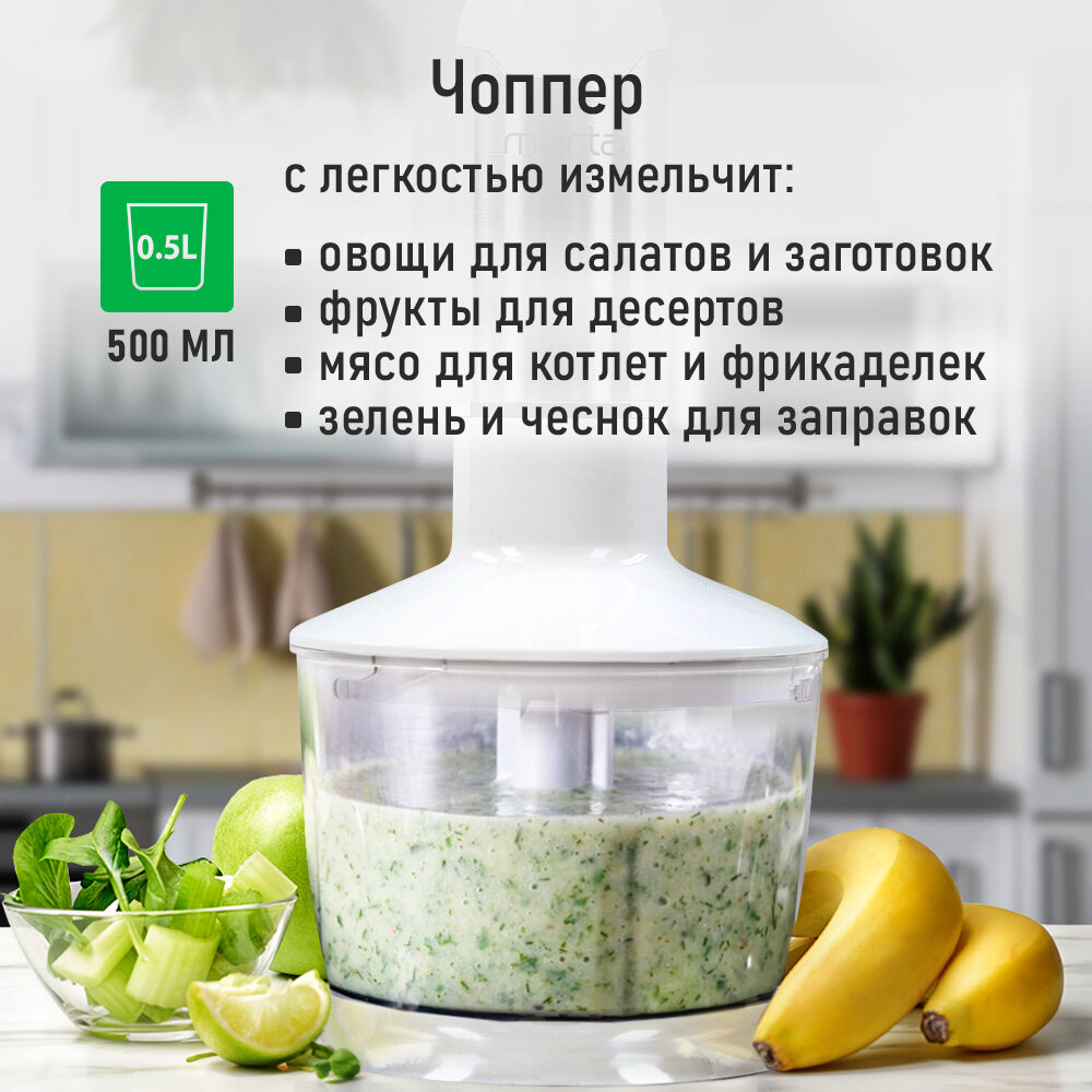Блендер погружной с насадками 3 в 1, 2000W, 2 скоростных режима, стальная насадка-блендер + чоппер 600мл + венчик + мерный стакан 500 мл, лезвия из нержавеющей стали, корпус инжекшн. Мощный кухонный процессор с металлической конструкцией обеспечивает надежность и высокую скорость измельчения. 2 скоростных режима для жидких и вязких продуктов, а также плавная регулировка скорости для предотвращения разбрызгивания смеси и плавного перехода к оптимальной скорости. Нож из нержавеющей стали не деформируется, не подвержен коррозии и имеет максимально длительный срок службы. Все самое необходимое уже в комплекте: - венчик для взбивания, - металлическая насадка блендер, - измельчитель с ёмкой прозрачной чашей, - мерный стакан 500 мл. Кухонный процессор предназначен для легкого измельчения, взбивания и смешивания различных продуктов до однородной массы. С его помощью можно приготовить полезные смузи и коктейли, ароматные супы-пюре и соусы, разнообразную выпечку, десерты, взбитые сливки, крем и мороженое. Он удобен и прост в использовании, легко впишется в дизайн любой кухни, не занимая много места, но при этом оставаясь всегда под рукой. Благодаря его использованию вы сможете включить в свой рацион больше свежих и полезных блюд. Приготовление блюд с использованием кухонная техника марта сделает ваши рецепты вкусными и полезными! Девайсы для кухни – ручной блендер для смузи – необычайно полезный прибор, измельчитель ручной для вкусного и здорового питания. Измельчение и смешивание, мощный удобный гаджет для приготовления вкусной и здоровой пищи, блендер электрический шейкер для коктейлей. Кухонный комбайн для домашних заготовок, миксер для крема. Взбиватель для соусов.