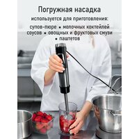Блендер погружной с насадками 4 в 1, измельчитель 0.6 л, мерный стакан 0.8 л, 2 скорости+ плавная регулировка скорости 2000 Вт Мощный кухонный процессор с металлическим съемным блендером обеспечивает надежность и высокую скорость измельчения. 2 скоростных режима для жидких и вязких продуктов, а также плавная регулировка скорости для предотвращения разбрызгивания смеси и плавного перехода к оптимальной скорости. Нож из нержавеющей стали не деформируется, не подвержен коррозии и имеет максимально длительный срок службы. Все самое необходимое уже в комплекте: - венчик для взбивания, - металлическая насадка блендер, - измельчитель с ёмкой прозрачной чашей, насадка для приготовления пюре, - мерный стакан 800 мл. Кухонный процессор предназначен для легкого измельчения, взбивания и смешивания различных продуктов до однородной массы. С его помощью можно приготовить полезные смузи и коктейли, ароматные супы-пюре и соусы, разнообразную выпечку, десерты, взбитые сливки, крем и мороженое. Он удобен и прост в использовании, легко впишется в дизайн любой кухни, не занимая много места, но при этом оставаясь всегда под рукой. Благодаря его использованию, Вы сможете включить в свой рацион больше свежих и полезных блюд. Мощность 2000 Вт - максимальная мощность мотора при блокировке двигателя. Приготовление блюд с использованием кухонная техника CHEF PRO сделает ваши рецепты вкусными и полезными! Девайсы для кухни – ручной блендер для смузи – необычайно полезный прибор, измельчитель ручной для вкусного и здорового питания. Измельчение и смешивание, мощный удобный гаджет для приготовления вкусной и здоровой пищи, блендер электрический шейкер для коктейлей. Кухонный комбайн для домашних заготовок, миксер для крема. Взбиватель для соусов.