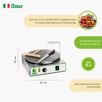 Блинница электрическая Fimar CRP используется на предприятиях общественного питания и торговли для быстрого выпекания традиционных русских блинчиков круглой формы. С профессиональной блинницей Fimar CRP блины готовятся быстрее, чем традиционным способом. Они прожариваются одинаково хорошо по всей поверхности, имеют идеальную форму и размер. Профессиональная блинница Fimar рассчитана на приготовление блюд в большом количестве, поэтому она служит долго. Изготавливается из нержавеющей стали. Это обеспечивает высокую прочность корпуса, поэтому аппараты «не боятся» падений и механических повреждений. Модель CRP4 имеет одну жарочную поверхность. Это хороший выбор для ресторанов и кафе, которые не готовят блины в больших объемах. Особенности Каркас блинницы выполнен из нержавеющей стали Жарочная поверхность из чугуна с пескоструйной обработкой с насечками против скольжения Защитный термостат на 0 ÷ 300° C Время приготовления составляет 1-3 минуты Регулируемые ножки