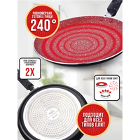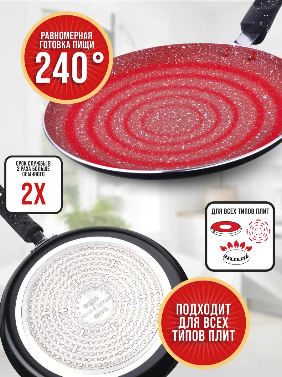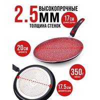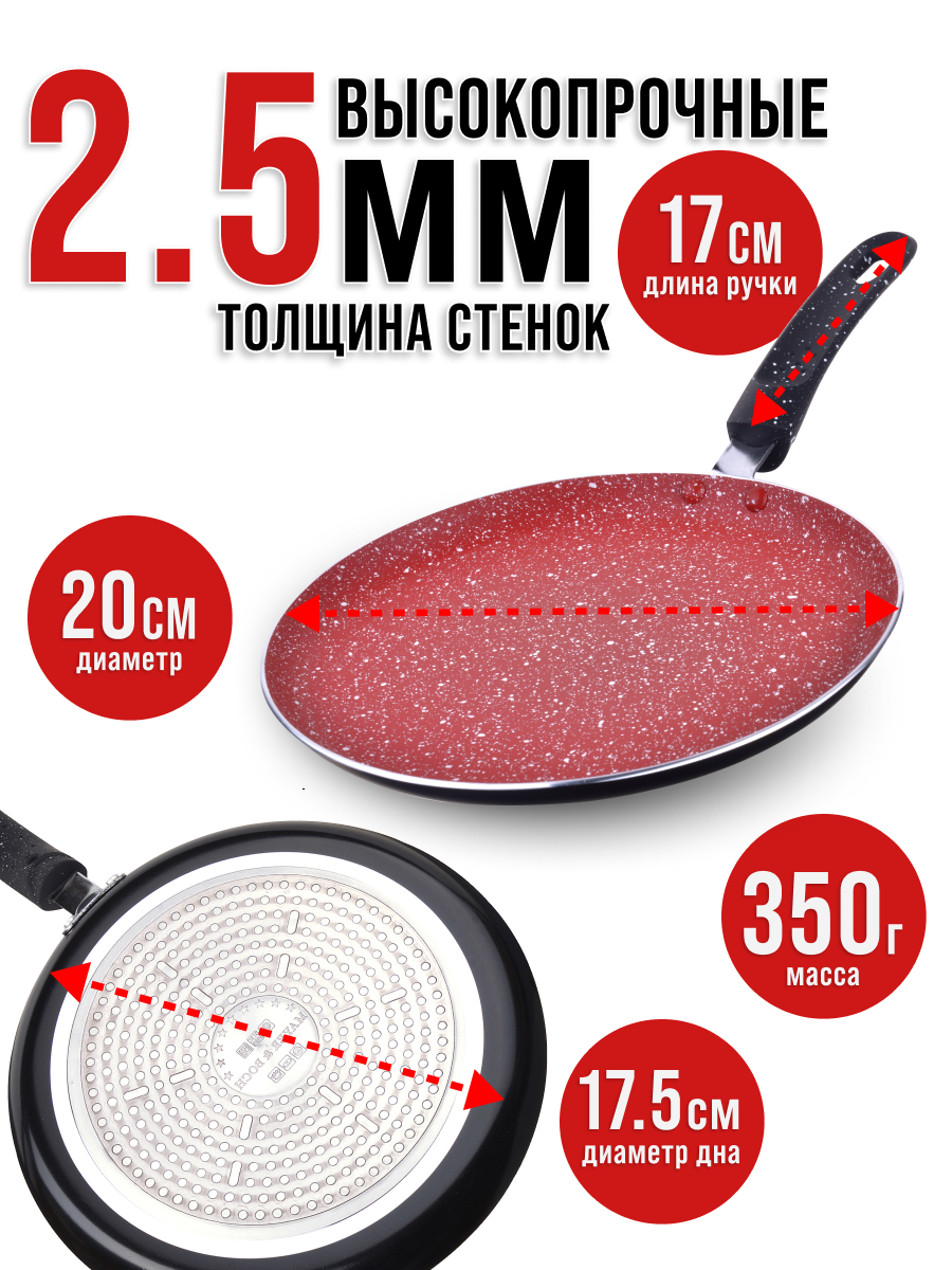 Сковорода блинная МВ (x12). Материал: алюминий. Покрытие: антипригарное. Дно: индукционное. Ручка: бакелит. Цвет: красный, мраморная крошка. Диаметр: 20см. Толщина стенок: 2,3 мм. Размер : 38 х 20 х 4 см. Вес: 329 г. Страна производитель: Китай.