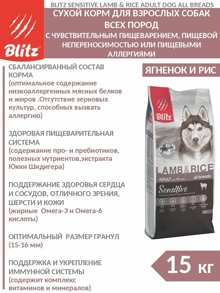Сухой корм для взрослых собак Blitz 15кг Sensitive Lamb&Rice Ягненок и рис: сравнение цен, характеристики, фото, актуальное наличие и цены.
