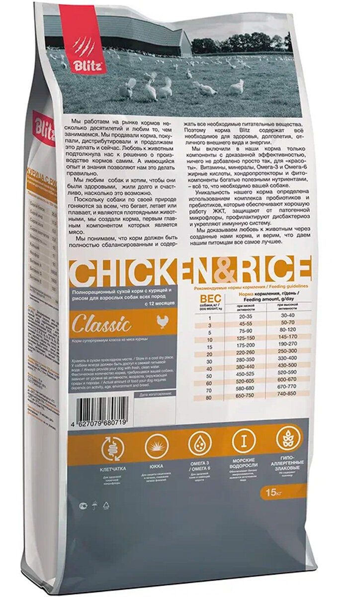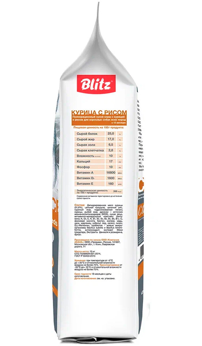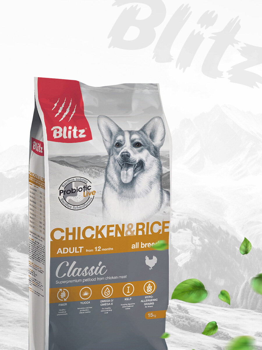 BLITZ CLASSIC ADULT ALL BREEDS CHICKEN & RICE для взрослых собак всех пород с курицей и рисом (15 кг): сравнение цен, характеристики, фото, актуальное наличие и цены.