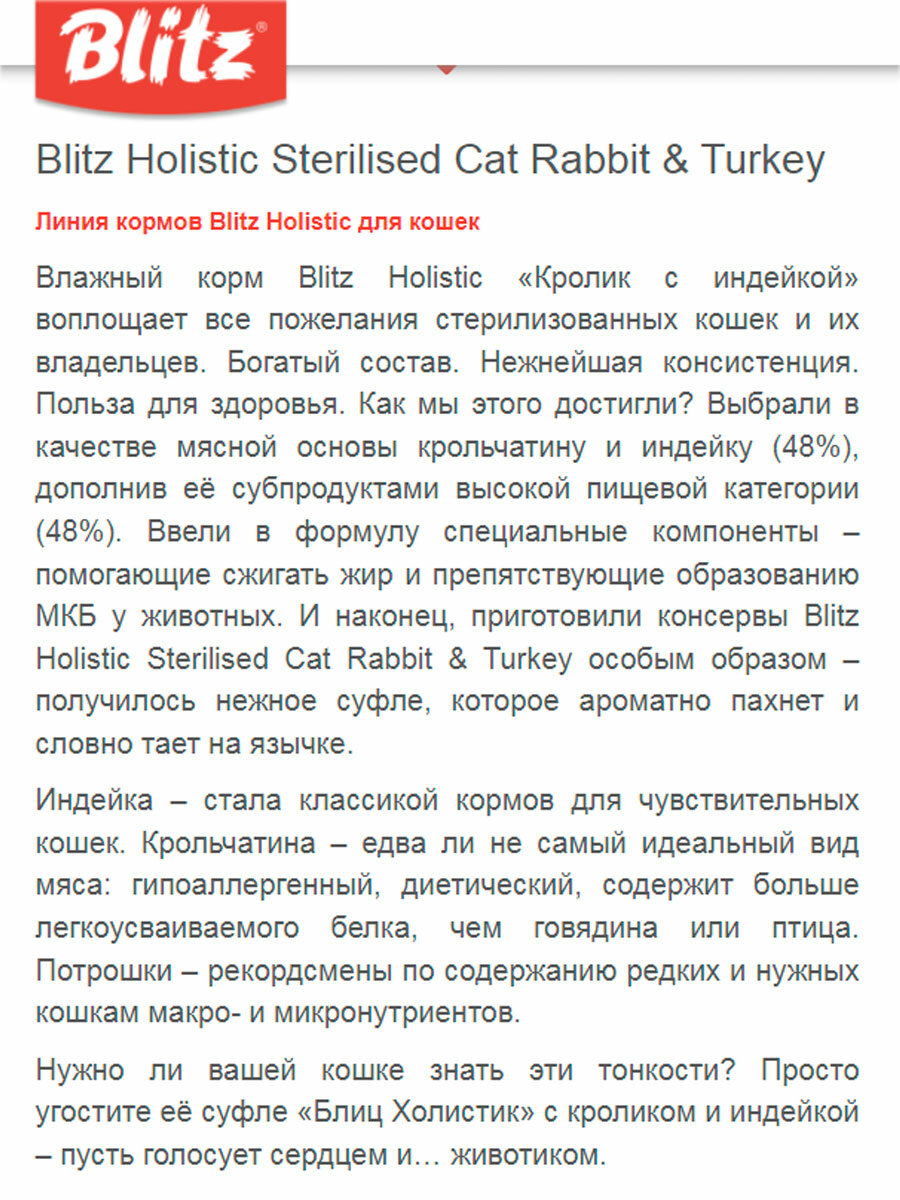 Купить BLITZ HOLISTIC STERILIZED для взр кастр кот и стер кош суфле кролик инд банка 200 гр 200 гр х 12 шт с доставкой по всей России.