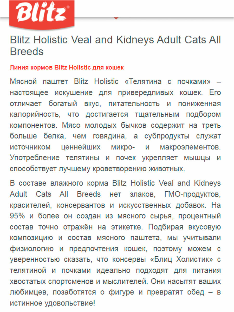 Мясной паштет Blitz Holistic «Телятина с почками» – настоящее искушение для привередливых кошек.