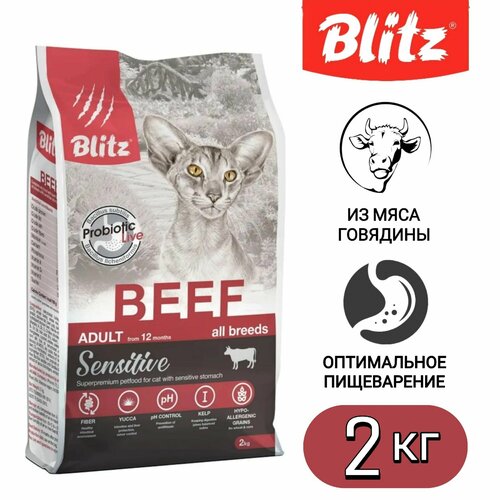 Сухой корм «Блиц» с говядиной — ещё один мясной питательный рацион линейки Blitz Sensitive для кошек. Он подходит для каждодневного питания взрослых и пожилых животных и содержит абсолютно все питательные вещества, которые нужны им для здоровья и долголетия. Главная особенность корма Blitz Sensitive Beef Adult Cats — использование легкоусвояемого, диетического мяса (говядины и индейки) и щадящих злаков (ячменя и риса), идеальных для кошек с нежным желудком и склонностью к аллергии. Что отличает корм «Блиц Сенситив» с говядиной для кошек? Говядина и индейка, при своей малой жирности, отличаются крайне богатым аминокислотным составом и содержат редкие микро- и макроэлементы (кобальт, селен, медь) в значимом количестве. Ни в одном виде мяса нет столько железа, как в говядине — она особенно незаменима для ослабленных кошек. А индейка — рекордсмен по содержанию триптофана, который положительно влияет на обмен веществ и гормональный фон животных. Ячмень и рис гиппоаллергенны, питательны и при этом обладают низким гликемическим индексом. В корм Blitz Sensitive Beef для кошек злаки добавлены в цельном виде — с сохранением оболочки и зародыша зерна, что делает их ещё более полезными. Формула содержит живые бактерии Bacillus, нормализующую микрофлору кишечника животных, а кроме того — усиливающие их действие пребиотики (инулин, MOS, FOS). Куриный и рыбий жир, входящие в состав рациона, обеспечивают потребности кошек в ненасыщенных жирных кислотах Омега-3 и Омега-6. С ними шерсть ваших питомцев будет блестящей, а кожа — здоровой. Правильный баланс минеральных веществ способствует здоровью мочевыделительной системы кошек. А ещё корм Blitz Sensitive Beef Adult Cats All Breeds отличает интересный вкус и заманчивый запах — проверено на привередливых кошках! Состав: Дегидрированная индейка и говядина (33%), цельный ячмень, цельный рис, гидролизованный белок, куриный жир, гидролизованная и дегидратированная печень, витаминно-минеральный комплекс: (витамины: А, Д3, Е, холин хлорид, бетаин, В3, В5, В2, В1, В6, фолиевая кислота, В12, калий, цинк, железо, марганец, медь, йод, селен, таурин), кукурузные рыльца, рыбий жир, дегидрированное яйцо, дрожжи (источник маннаноолигосахаридов – MOS), сушеные яблоки, семена льна, антиоксидант, DL-метионин, экстракт фенхеля, тимьян, топинамбур (источник инулина – фруктоолигосахарид (FOS)), пробиотик — живые микроорганизмы Bacillus subtilis и Bacillus licheniformis, экстракт Юкки Шидигера, экстракт фукуса.