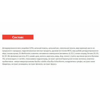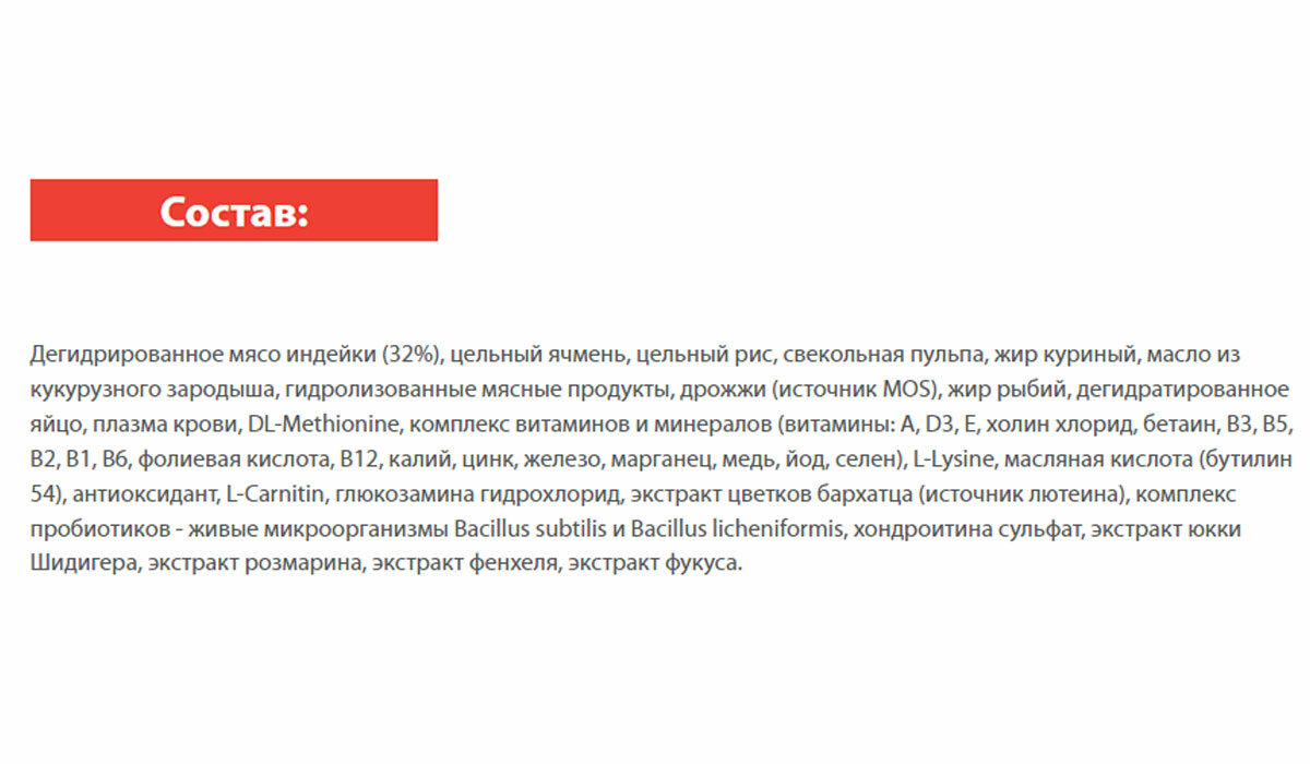 Дегидрированное мясо индейки (32%), цельный ячмень, цельный рис, свекольная пульпа, жир куриный, масло из кукурузного зародыша, гидролизованные мясные продукты, дрожжи (источник MOS), жир рыбий, дегидратированное яйцо, плазма крови, D, L-Methionine, комплекс витаминов и минералов (витамины: А, D3, Е, холин хлорид, бетаин, В3, В5, В2, В1, В6, фолиевая кислота, В12, калий, цинк, железо, марганец, медь, йод, селен), масляная кислота (бутилин 54), L-Lysine, антиоксидант, L-Carnitin, глюкозамина гидрохлорид, экстракт цветков бархатца (источник лютеина), ксилоолигосахариды (пребиотики), комплекс пробиотиков - живые микроорганизмы Bacillus subtilis и Bacillus licheniformis, хондроитина сульфат, экстракт юкки Шидигера, экстракт розмарина, экстракт фенхеля, экстракт фукуса.