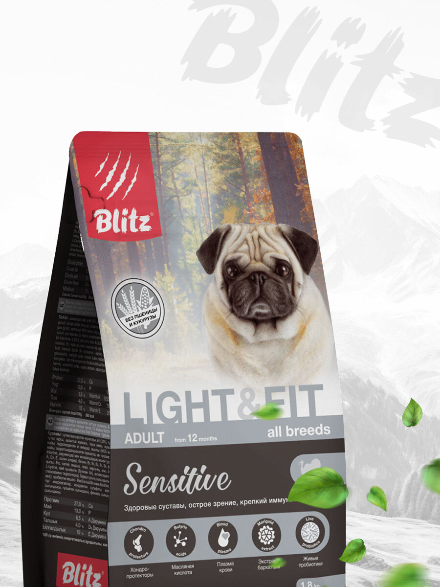 На сегодня избыточный вес является одной из самых частых проблем среди домашних животных. Недостаточная активность, сбои в режиме питания, породная предрасположенность — всё это влияет на набор лишних килограммов. Сбросить их не так легко, но крайне желательно, если вы хотите, чтобы ваш питомец был здоров и долго жил полноценной жизнью. Помочь в этом может специализированный корм — предназначенный именно для собак с лишним весом Blitz Sensitive Light.