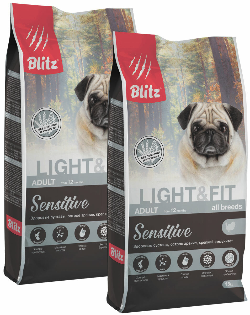BLITZ SENSITIVE ADULT ALL BREEDS LIGHT & FIT диетический для взрослых собак всех пород с индейкой 15 + 15 кг: сравнение цен, характеристики, фото, актуальное наличие и цены.