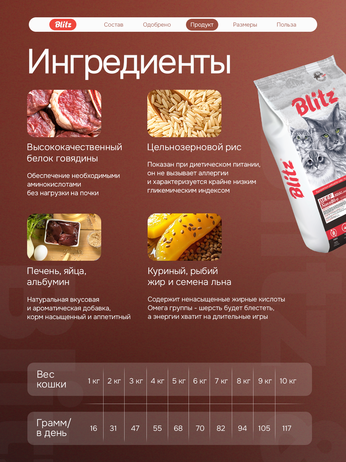 Корм «Блиц» с говядиной обладает насыщенным вкусом и аппетитным ароматом, который оценят даже самые привередливые кошки. Это не просто питание, а забота о здоровье и благополучии вашего питомца на долгие годы!