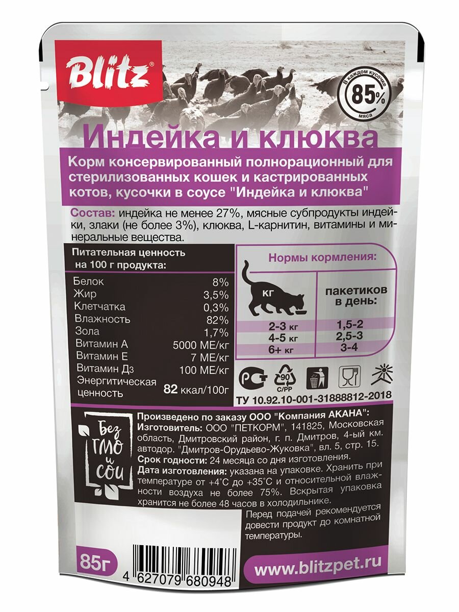 Blitz Sensitive Влажный корм для стерилизованных кошек, индейка и клюква в соусе 85 гр x 24шт: сравнение цен, характеристики, фото, актуальное наличие и цены.