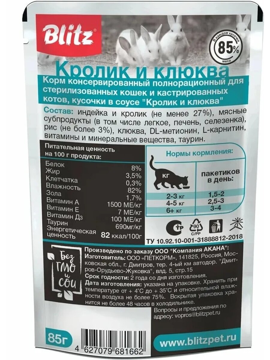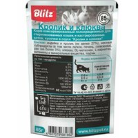 Blitz Sensitive Влажный корм для стерилизованных кошек, нежные кусочки в соусе, кролик с клюквой 85гр х 24шт: сравнение цен, характеристики, фото, актуальное наличие и цены.