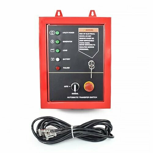 Данный блок (шкаф АВР) предназначен для автоматического запуска электростанции в случае отключения внешней сети и переключения потребителей на питание от генератора.В блоке установлены 2-х полюсные контакторы 25А (max 40A) на 1 полюс, устройство контроля напряжения, зарядное устройство АКБ. На шкафу имеются: индикация состояния сети, переключатель режима работы (автоматический или ручной), кнопка аварийной остановки, гермовводы для подключения силовых кабелей, разъем для подключения контрольного (сигнального) кабеля управления электростанцией.Блок комплектуется контрольным кабелем длиной 5 метров