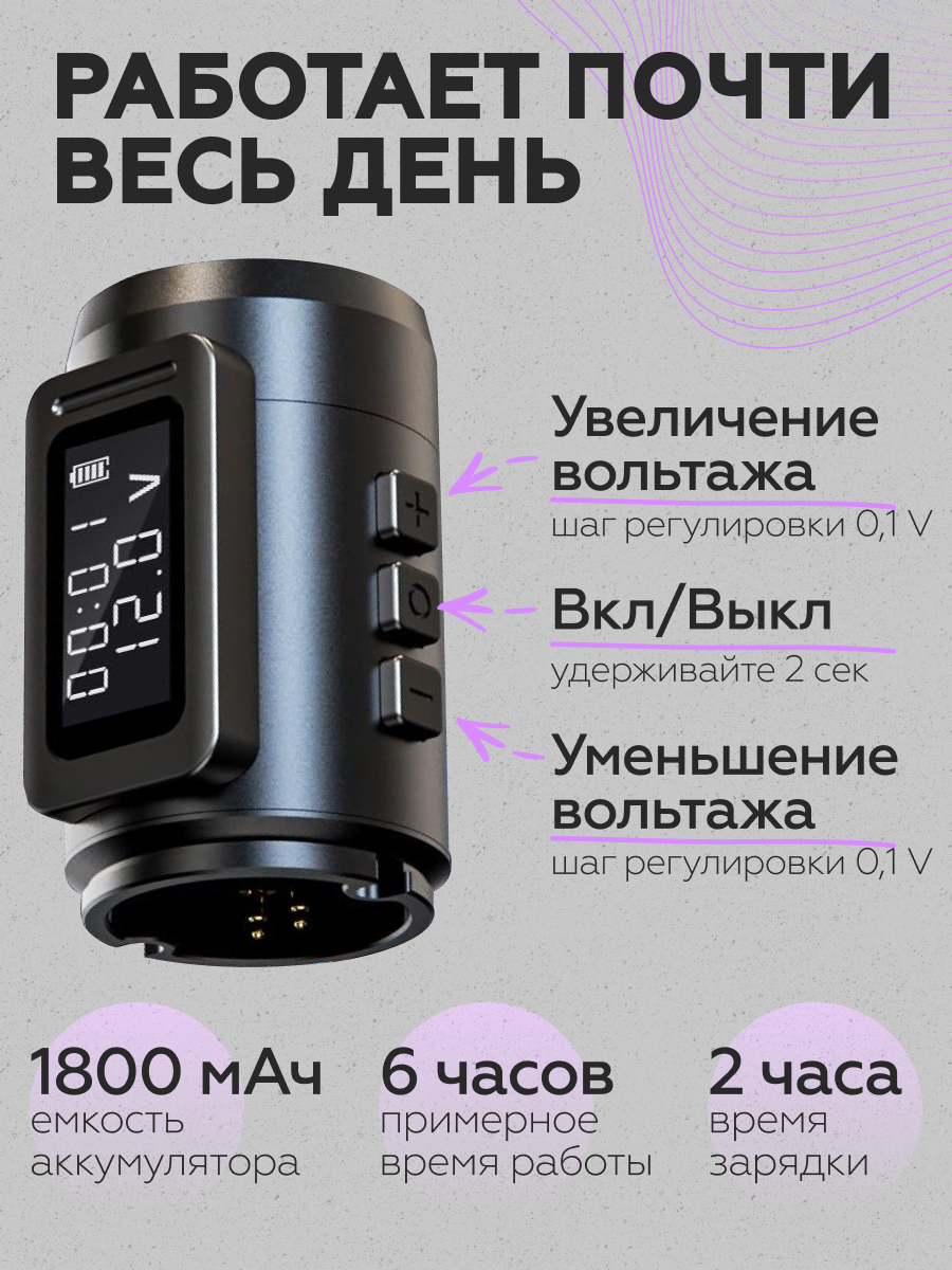 Выбирая блок питания Ambition Mars Battery, вы получаете дополнительный аккумулятор для тату-машинки Ambition Mars, который обеспечит бесперебойную работу и позволит вам отработать любой сеанс без перерыва.