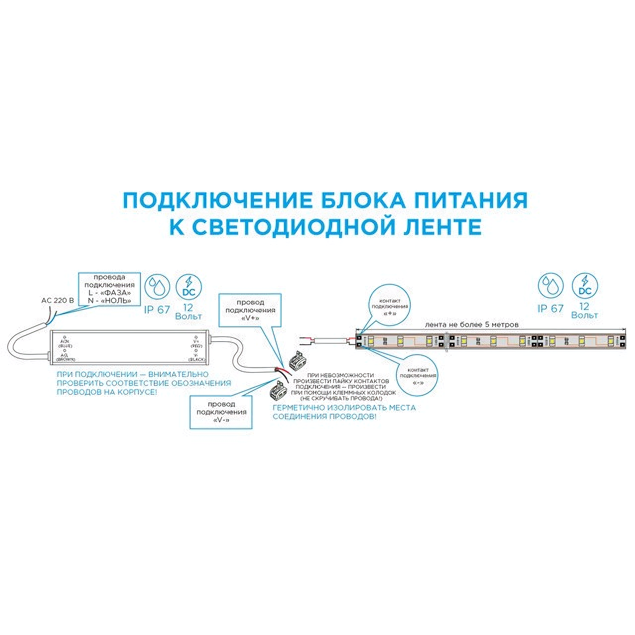 Компактный алюминиевый корпус размером 215х68х40мм позволяет легко найти место для монтажа в любом интерьере и спрятать блок питания в местах с ограниченным пространством. Благодаря цветовой маркировке и обозначениям на корпусе, подключение блока питания будет простым и быстрым.