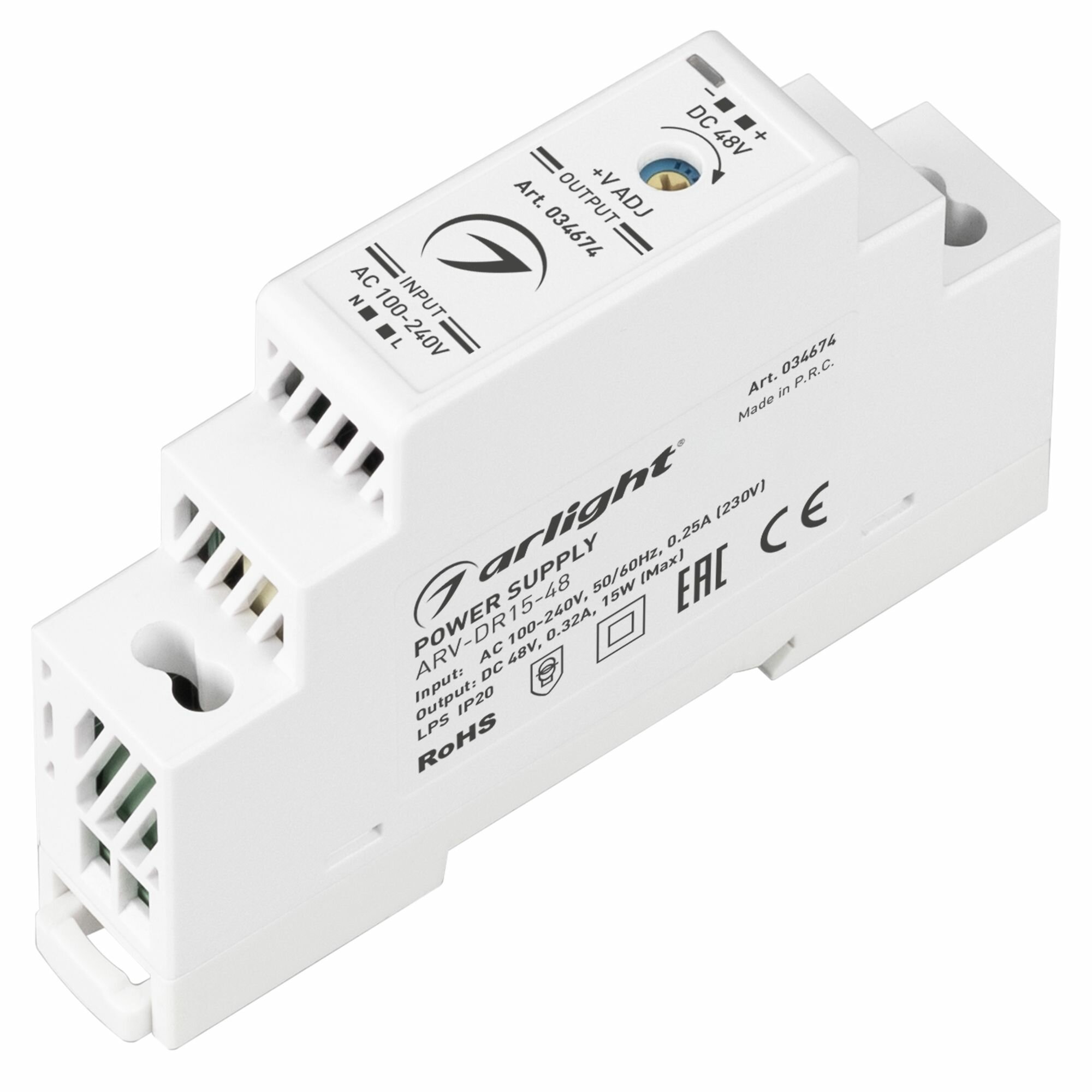 Источник напряжения с гальванической развязкой для светодиодных изделий. Входное напряжение 100-240 VAC. Выходные параметры: 48 В, 0.32 А, 15 Вт. Негерметичный пластиковый корпус IP 20 для установки на DIN-рейку. Габаритные размеры длина 58 мм, ширина 17.5 мм, высота 90 мм. Гарантийный срок 3 года.