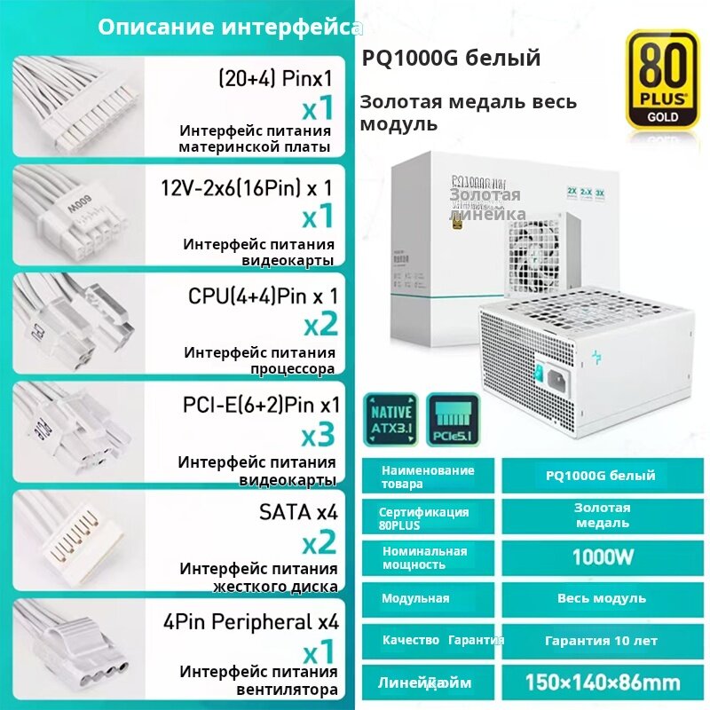 DEEPCOOL PQ1000G - это блок питания мощностью 1000 Вт 80 PLUS Gold, сертифицированный ATX с высокой эффективностью и стабильностью. Идеально подходит для высокопроизводительных игровых ПК и рабочих станций. Ниже приведено введение в основные функции этого блока питания:
