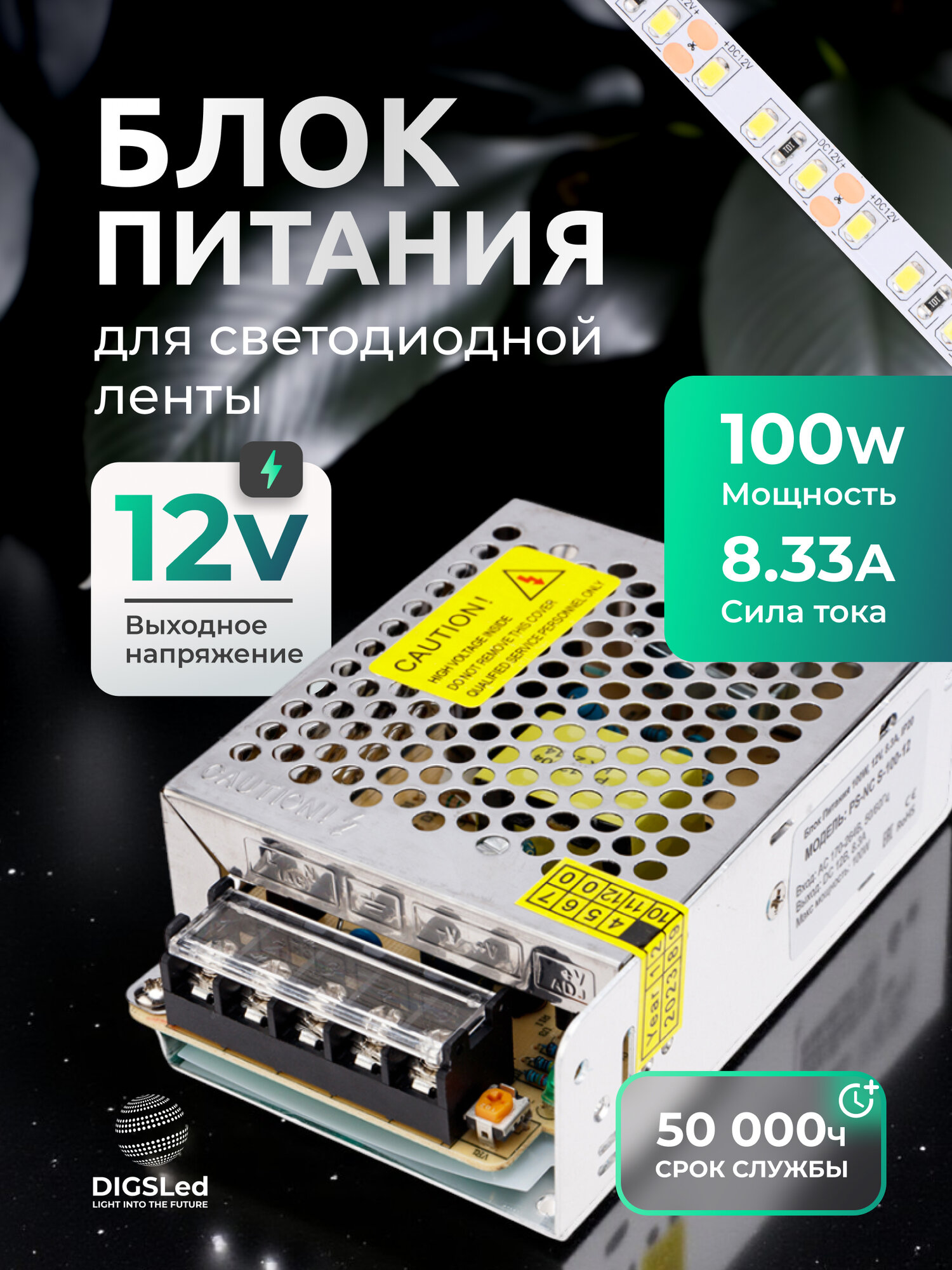 Блок питания для светодиодной ленты 12V, 100W, IP20, 8.3А DIGSLED: сравнение цен, характеристики, фото, актуальное наличие и цены.