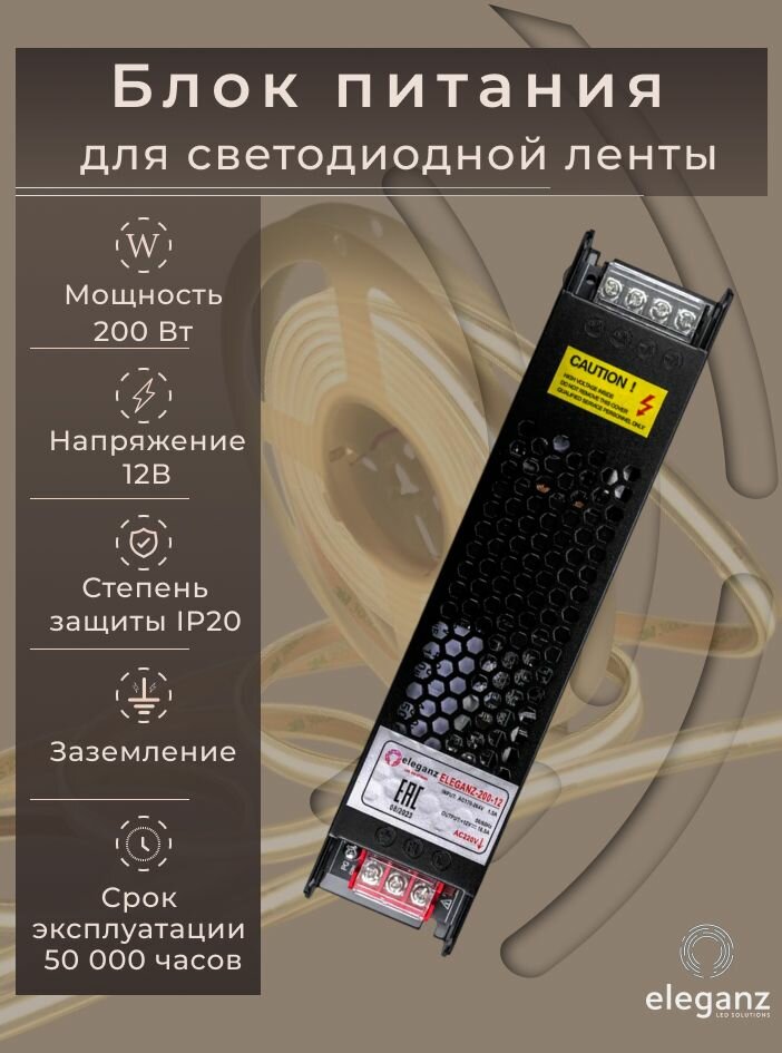 Источник питания, трансформаторы для светодиодных лент, бренда «Eleganz» преобразовывают переменный ток из сети с напряжением 220В в постоянный ток 12В обеспечивая оптимальную работу светодиодных осветительных приборов и других устройств.