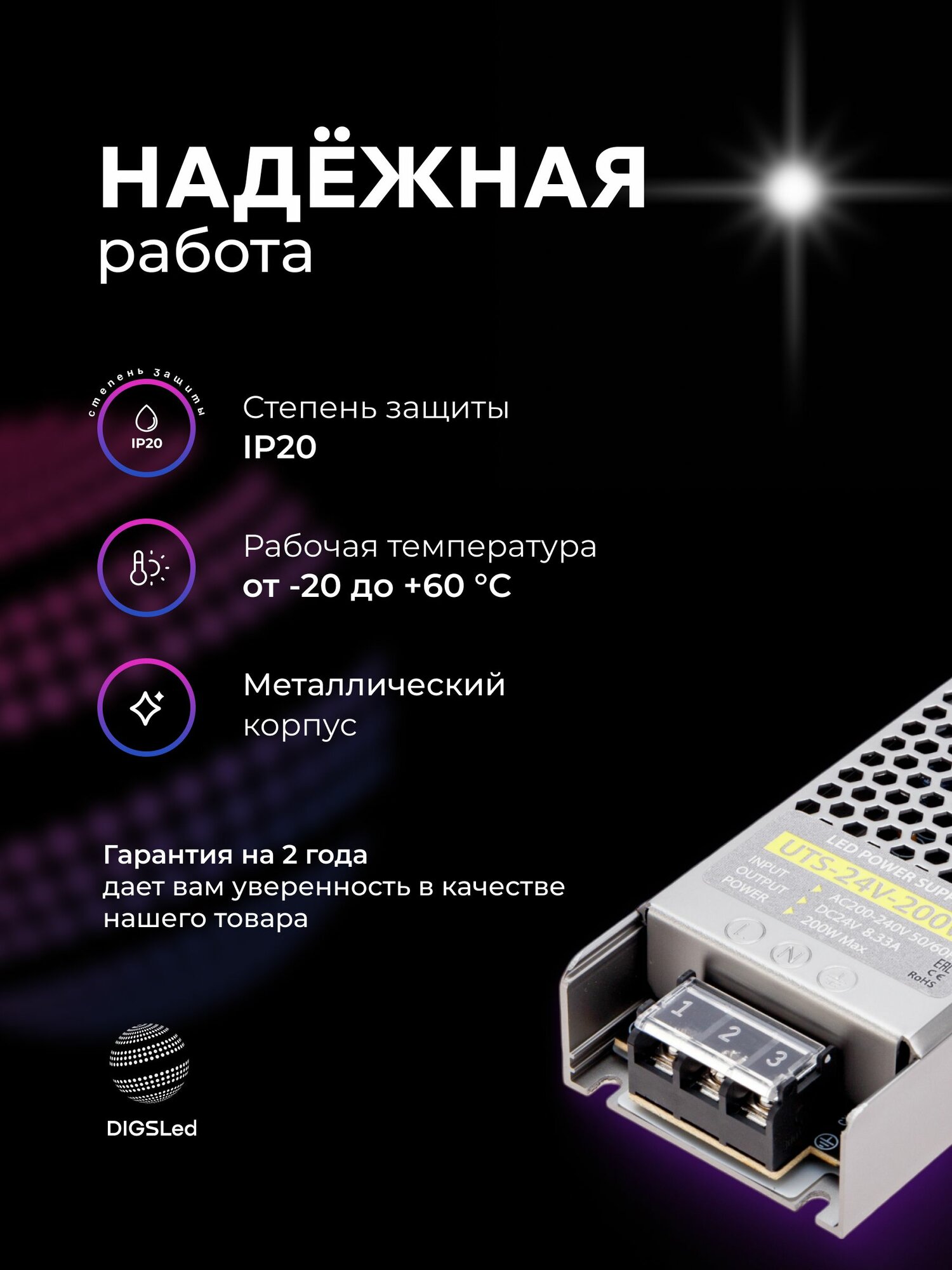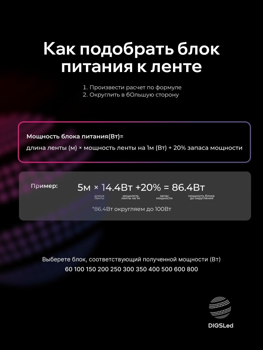 Источник питания DIGSLED — это универсальный блок питания на 24 вольт, который подойдёт для любых задач, связанных с подключением LED-лент и светильников. Гарантия 2 года подтверждает высокое качество и надёжность изделия. Выбирая блок питания 24 вольт для светодиодной ленты DIGSLED, вы получаете долговечное, безопасное и эффективное устройство, которое обеспечит бесперебойную работу вашего освещения при температуре от -15°C до +40°C.