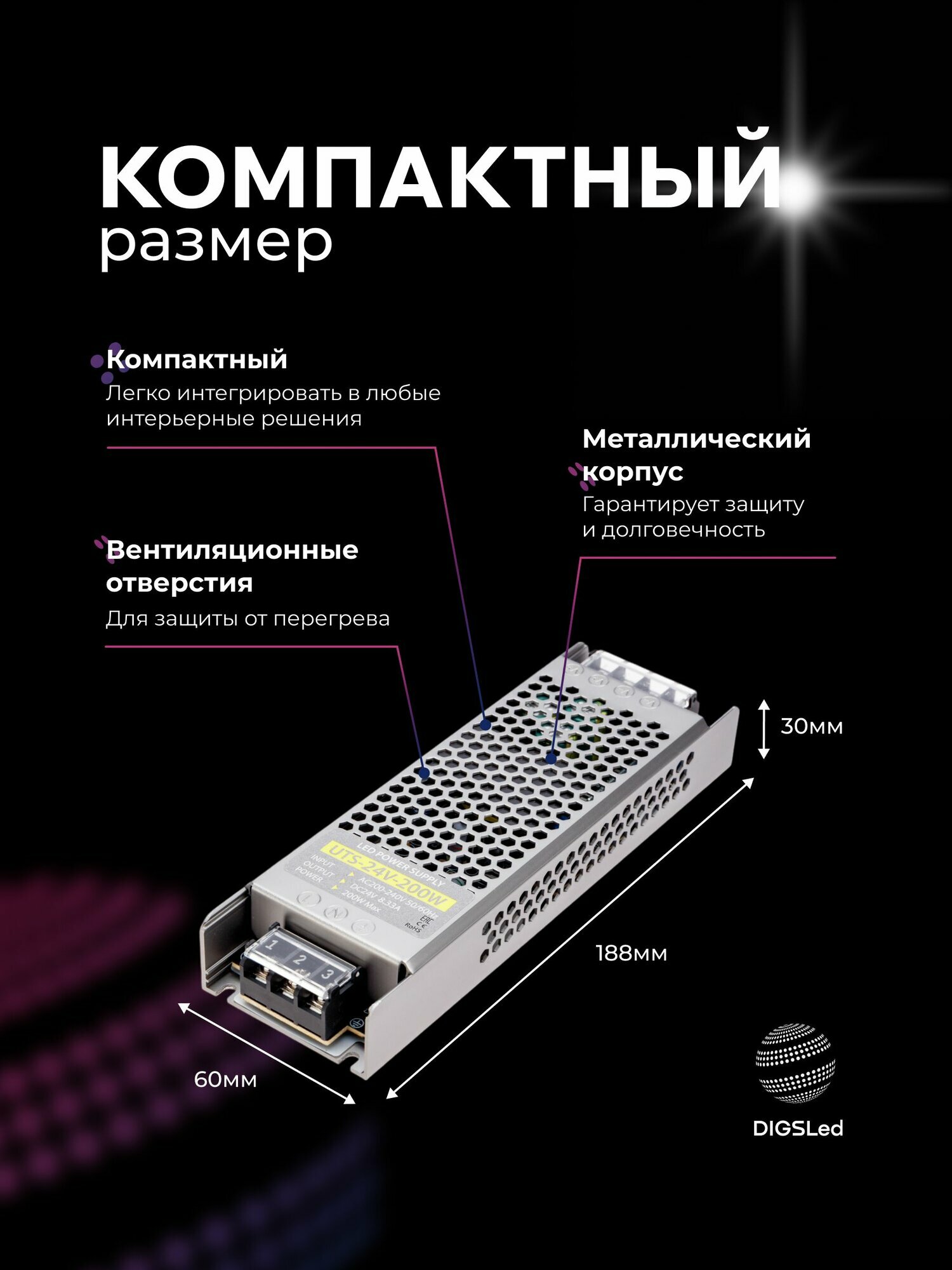 Блок питания для светодиодной ленты 24V, 200W, IP20 DIGSLED — это надежное и эффективное решение для организации освещения в доме, офисе или коммерческих помещениях. Данный блок питания 24v предназначен для стабильного и безопасного питания вашей ленты светодиодной или светильников, обеспечивая стабильную работу даже при длительной эксплуатации. Благодаря выходной мощности 200W и току 8,3А, этот драйвер для светодиодной ленты 24В подходит для подключения мощных и длинных светодиодных лент, а также различного светодиодного оборудования.