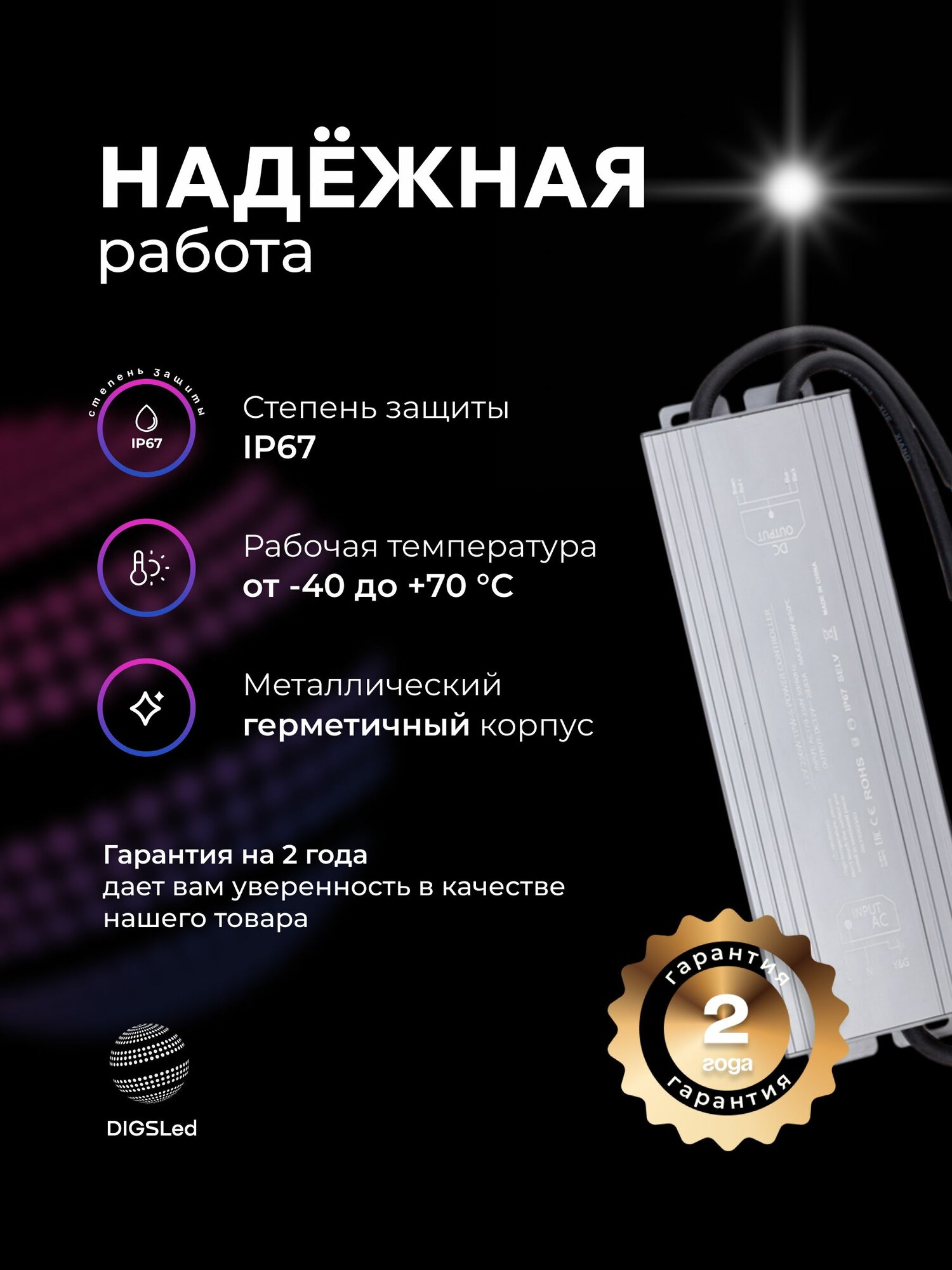 Купить Блок питания для светодиодной ленты 24V, 250W, IP67, 10,4A DIGSLED с доставкой по всей России.