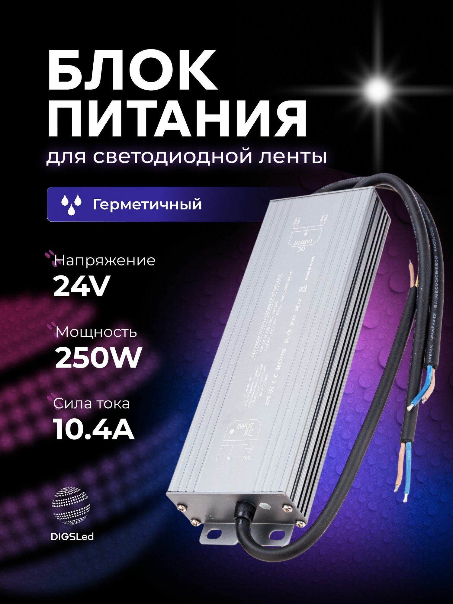 Блок питания для светодиодной ленты 24V, 250W, IP67, 10,4A DIGSLED: сравнение цен, характеристики, фото, актуальное наличие и цены.
