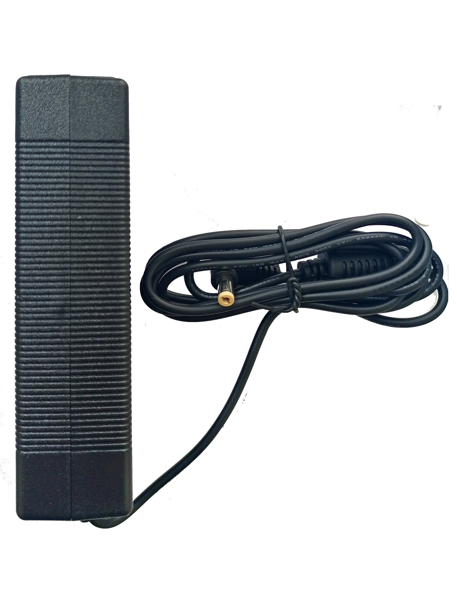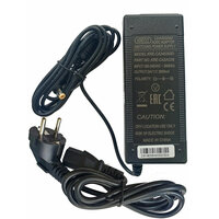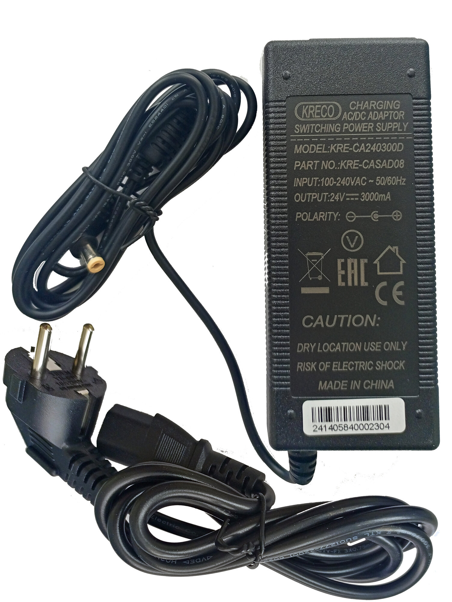 Можно упомянуть, что полярность данного зарядного устройства положительная (плюс в центре). Предоставляет постоянное стабилизированное напряжение 24В и ток 3000 мА. Г-образный штекер5,5 x 2,1 мм. Длина кабеля составляет 100 см, однако в комплекте также идёт сетевой адаптер, шнур которого 150 см.