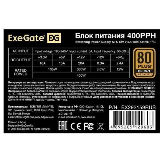 Соответствие стандартам: CE, FCC, CB, UL, TUV, BSMI, CCC, EAC, 80 PLUS Bronze