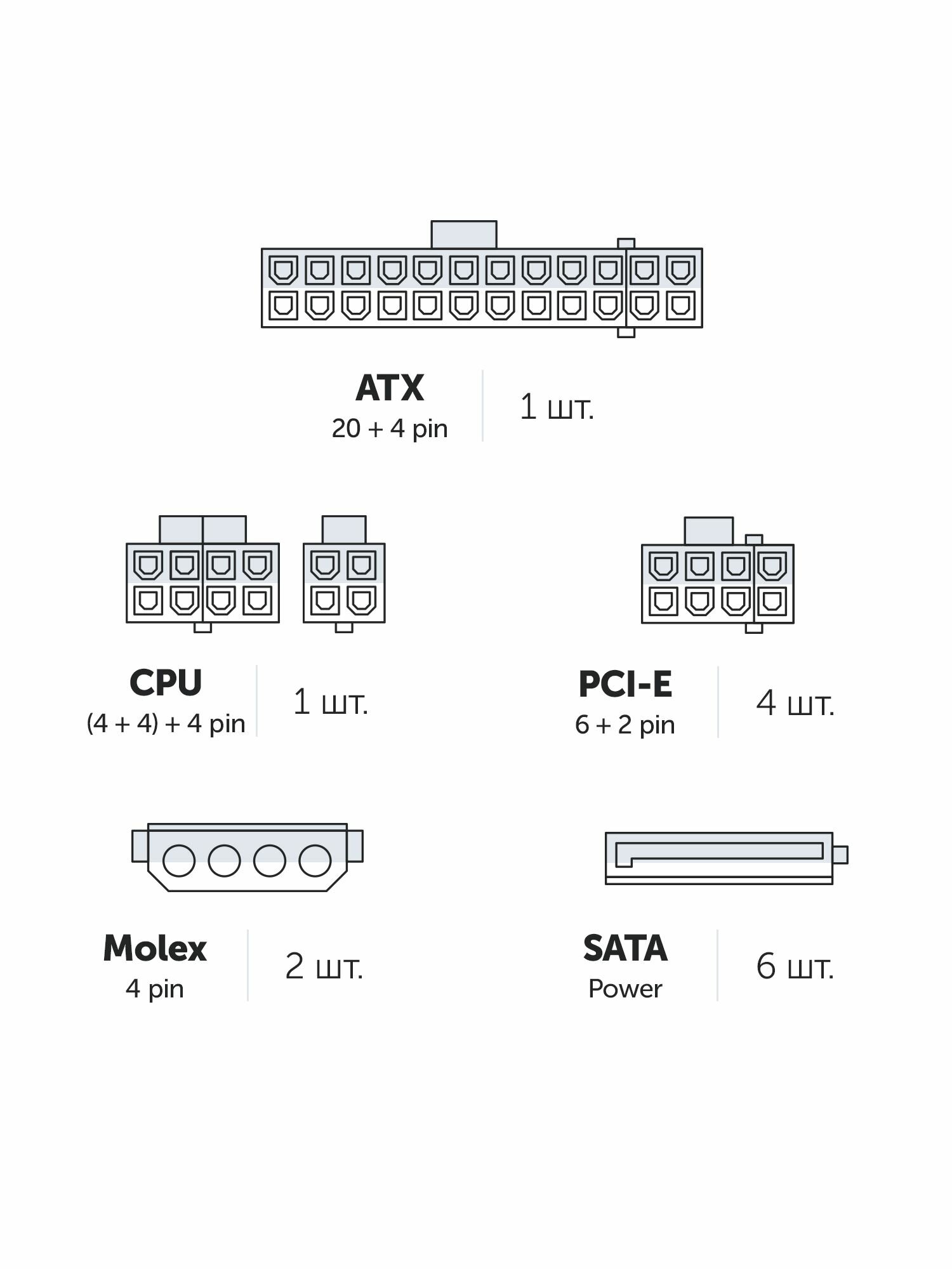 Контроль на всех этапах производства, тщательный подбор компонентов и соответствие стандарту ATX версии 2.4 позволяют получить характеристики, подобающие стандарту 80 PLUS BRONZE и обеспечить высокий уровень качества. Реализация системы активной коррекции коэффициента мощности (PFC), дают возможность более эффективно использовать электроэнергию. Применение отдельного преобразователя DC-DC сделало допустимым не только получение мощности в 684 Вт по основной линии +12V, но и устранило возможный дисбаланс электрической нагрузки, уменьшило шумовой порог линии и дополнительно защитило компоненты ПК.