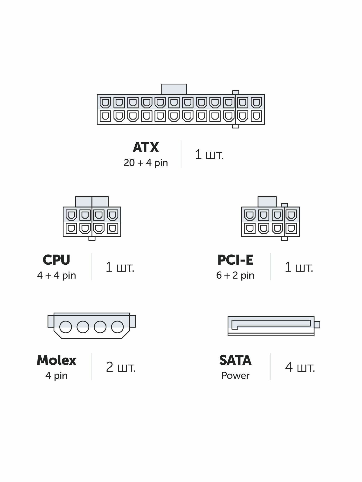 • OCP – защита от скачков и перегрузки по току отдельных линий. Помогает избежать ситуаций, когда нагрузка на одну линию может привести к перегреву или выходу из строя компонентов блока питания.