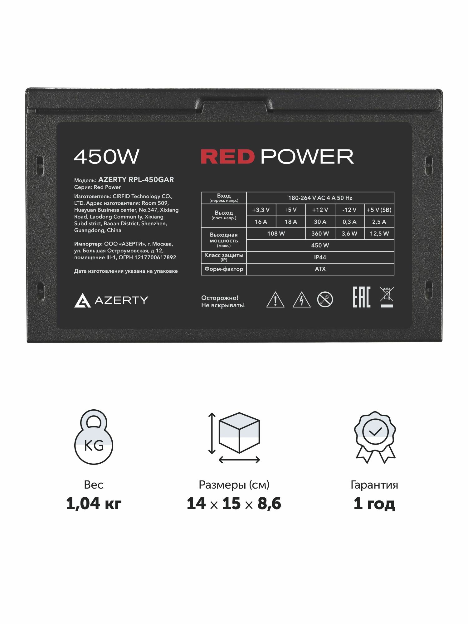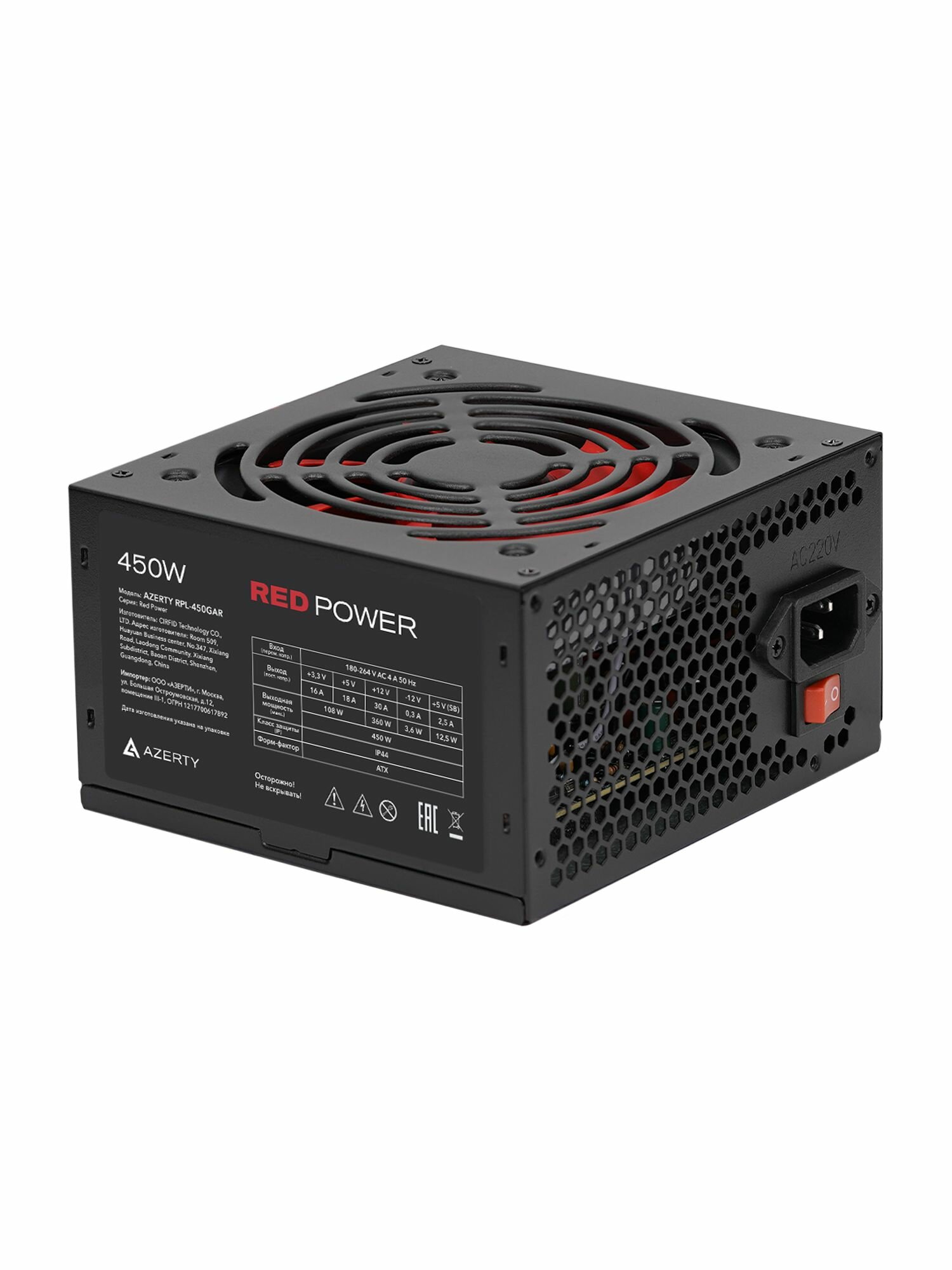 Блок питания Azerty RPL-450 представляет собой устройство с общей максимальной мощностью 450 Ватт. Он разработан для обеспечения стабильной работы компьютеров, которым не требуется могучий источник питания, например, офисных ПК, терминалов.