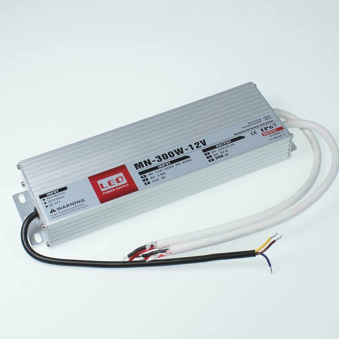 Источник стабилизированного напряжения 12V 300W 25A. В металлическом корпусе. Степень защиты IP67. Входное напряжение 90-264V, выходное напряжение 12V. Рабочая температура -30 - +45 градусов. Размеры 260x76x34мм. Вес 1080г. Гарантия 1 год.