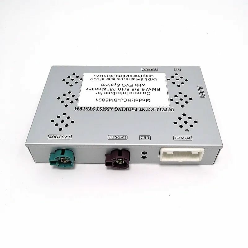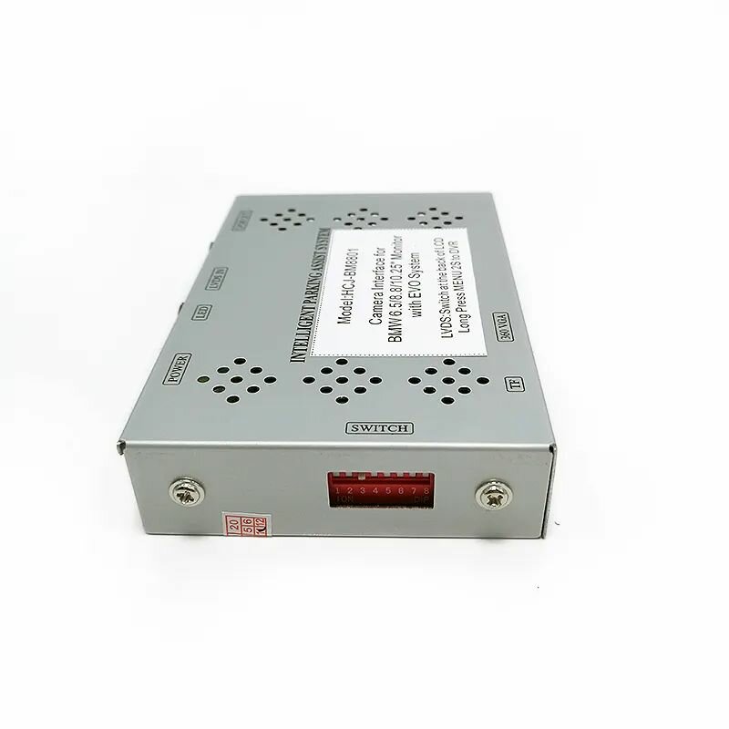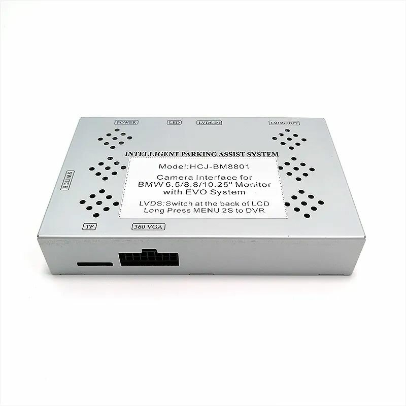 Данный адаптер (интерфейс) позволяет установить камеру переднего и заднего вида на автомобили BMW с системами NBT EVO от 2017 года выпуска с реализацией линий интеллектуальной парковки «IPAS» и отображением штатных парктроников при движении назад, а также имеет дополнительный видео вход. Переключение между задней и передней камерами осуществляется автоматически при переходе селектора АКПП с rear в drive. После автоматического включения передней камеры её отключение происходит также автоматически при достижении скорости в 20 км/ч.