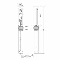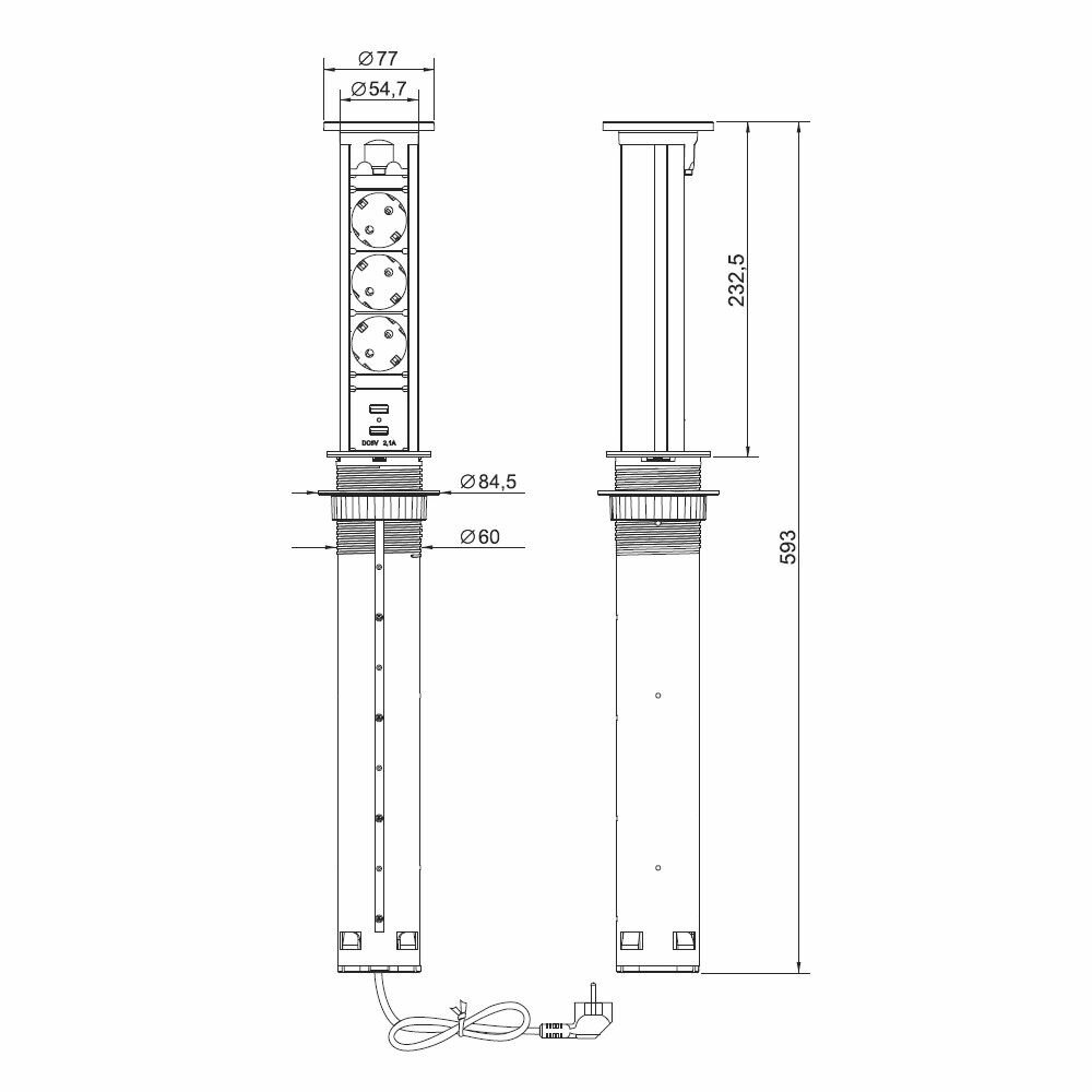 Блок выдвижных розеток GLS изготовлен из ударопрочного ABS-пластика в черно-сером цвете. Моторизованная система автоматически поднимает и опускает розетки с помощью легкого нажатия. А также позволяет выдвигать блок не на полную высоту.