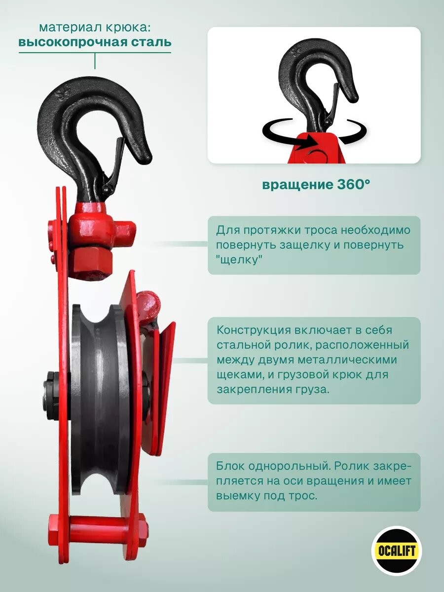 Производитель OCALIFT уделяет внимание деталям и качеству своей продукции. Блок имеет красный цвет, что делает его заметным и легко узнаваемым на фоне других элементов такелажа.