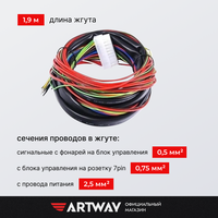 Блок согласования предназначен - для подключения всех классов автомобилей с раздельным и совмещенным управлением ламп (однонитевые и двухнитевые). Длина жгута- 1,9 м Сечения проводов в жгуте: сигнальные с фонарей на блок управления: 0,5 мм 2, с блока управления на розетку 7pin: 0,75 мм2 с провода питания 2,5 мм2 Диапазон рабочих температур: от - 40С до +70С Материал - высококачественный пластик, устойчивый к низким температурам и механическим воздействиям Смарт коннект Artway SC-100-N выполняет следующие функции: управление задними указателями поворота, управление задними габаритными огнями, управление задними стоп-сигналами, управление задними противотуманными фонарями, автоматическое определение подключение прицепа. Предусмотрены следующие виды защиты изделия: защита от переполюсовки питания, защита от повышенного напряжения питания, защита от короткого замыкания в нагрузке, защита от перегрева с отключением, при достижении пороговых значений температуры. Важно! 1) Эксплуатация изделия применима только на автомобилях с номинальным напряжением 12В. 2) Устройство не предназначено для использования на автомобилях с отрицательной полярностью на проводах управления световыми приборами. 3) Монтаж устройства осуществляется путем подключения к штатной проводке автомобиля с использованием клипс или пайки. Данные работы должны производится в специализированном сертифицированном установочном центре. Неправильное подключение может привезти к выходу из строя устройства или автомобиля. 4) Внимательно проверяйте нумерацию и цвет проводов при подключении к розетке. 5) При монтаже проводки важно обеспечить надежный контакт при соединении. 6) При подключении к фонарю стоп сигнала с однонитевой лампой (стоп сигнал + габарит) рекомендуем брать управление с повторителя стоп сигнала на крышке багажника или за задним стеклом. 7) Подключение красного провода к АКБ обязательно осуществлять через предохранитель 15А