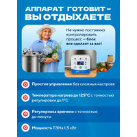 | Дополнительная информация | На крышке автоклава есть стандартное 1,5-дюймовое кламповое отверстие. При желании вы можете снять заглушку, установить на ее место бражную колонну и использовать автоклав как самогонный аппарат! |