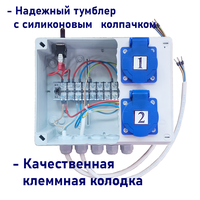 В блоке управления используются качественные комплектующие ведущих производителей:- корпус блока управления имеет степень пыле-влагозащиты защиты IP 56- на корпусе блока управления предусмотрено 4 герметичных вводов (сальников типа PG) с IP68 степенью защиты - верхняя панель блока управления состоит из тумблера и силиконового влагозащитного колпачка- две розетки для подключения одного компрессора и насоса имеют заземление и степень защиты IP 54- усиленная клеммная колодка серии ТВ