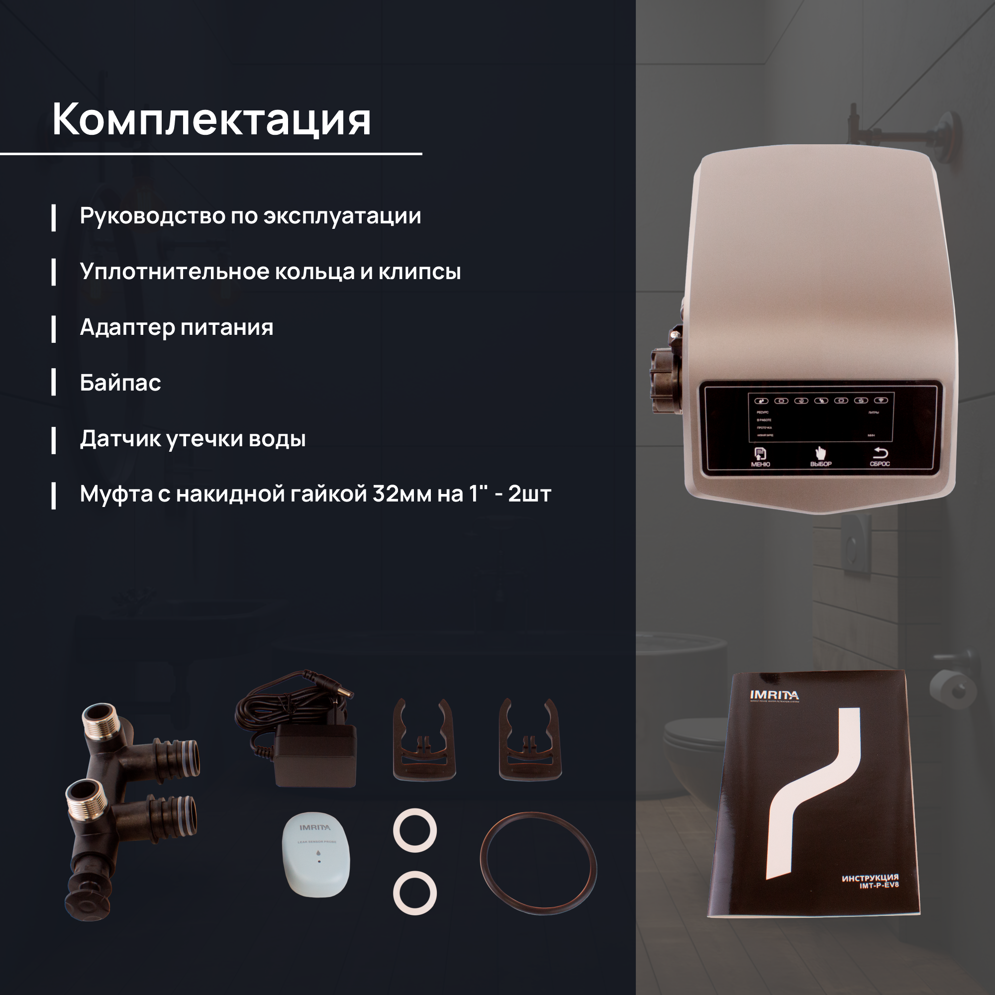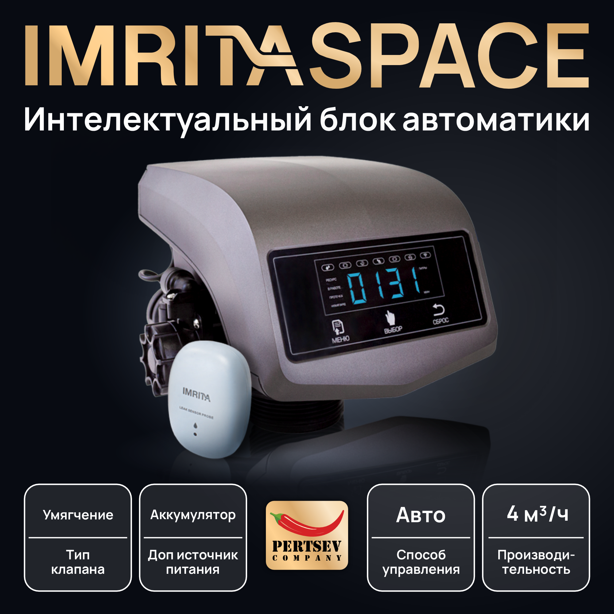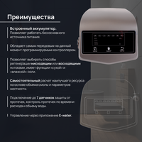 Многофункциональный блок автоматики Imrita Space (P-EV8) обладает самым передовым, на данный момент, программируемым контроллером. Поставляется с байпасом. Позволяет выбирать способы регенерации нисходящим или восходящим потоками, имеет функции «сухой» или «влажной» соли, а также нехватки соли, подключение до 7 датчиков защиты от протечек, контроль протечек по времени расхода и объему воды, дополнительный источник питания литиевая батарея позволяет работать клапану при отключении основного питания. Самостоятельный расчет наилучшего ресурса на основе объема смолы и параметров жесткости воды. Интеллектуальное соединение по Wi-Fi, с очень удобным меню позволяет дистанционно через мобильное приложение E-water, управлять клапаном без присутствия на месте.