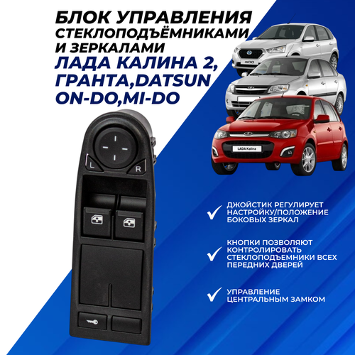 - Блок управления передними стеклоподъёмниками и зеркалами Лада Калина 2, Гранта, Datsun Блок кнопок стеклоподъемников предназначен для автомобилей Ваз Лада Лада Калина 2, Лада Гранта, Датсун он-До. Блок является важной деталью, обеспечивающей комфорт и безопасность во время движения, позволяет управлять подъемом и опусканием стекол с помощью кнопок, расположенных на двери автомобиля.