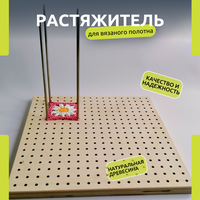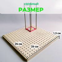 Размер доски 26х26 см. Расстояние между отверстиями 1 см. Прочные металлические прутки качественно обработаны и не будут цепляться за полотно. Они выдержат натяжение полотна, нельзя будет случайно сломать. Для удобного хранения прутки упакованы в мешочек для хранения.