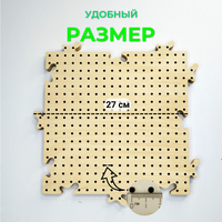 Размер доски 26х26 см. Расстояние между отверстиями 1 см. Прочные металлические прутки качественно обработаны и не будут цепляться за полотно. Они выдержат натяжение полотна, нельзя будет случайно сломать. Для удобного хранения прутки упакованы в мешочек для хранения.