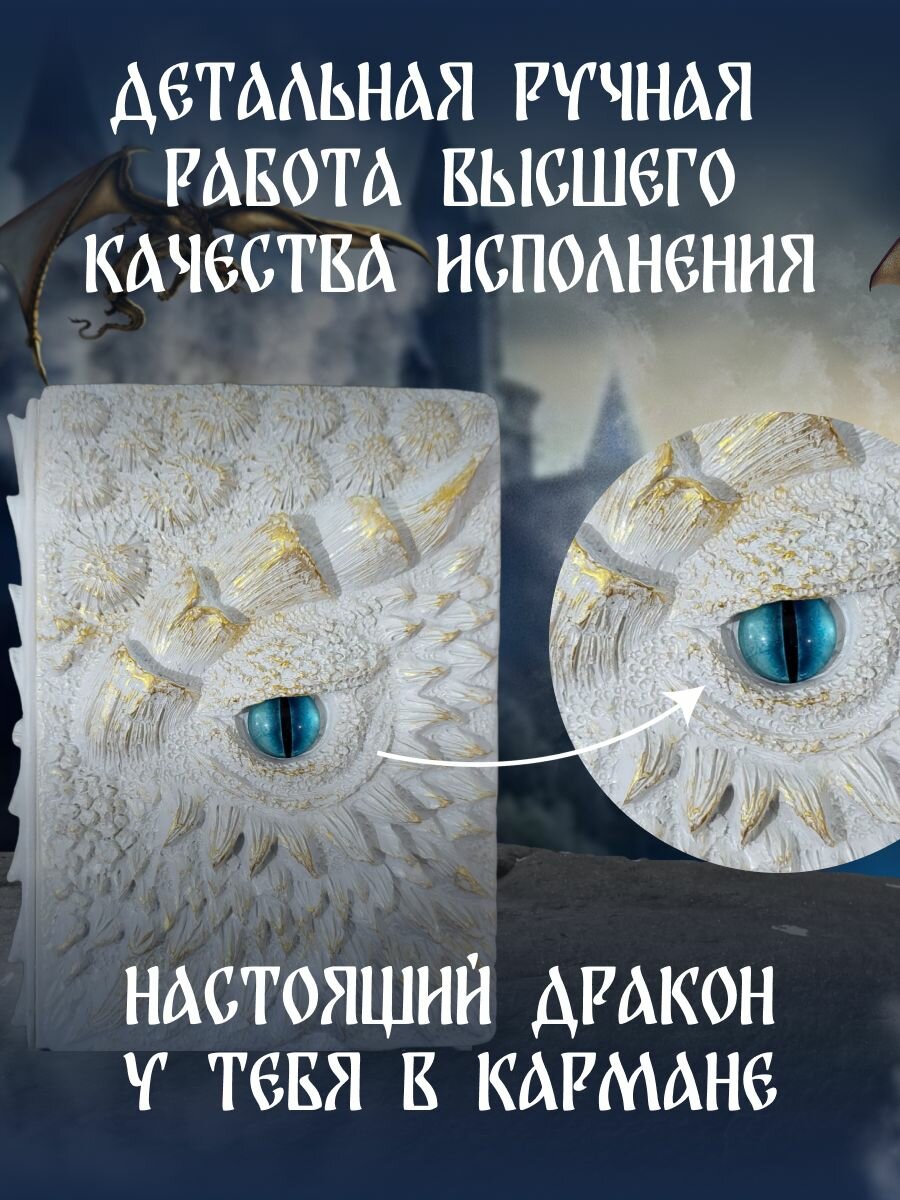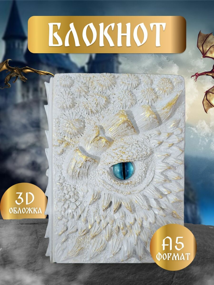 Крутой мерч - объемный и тяжелый (весит почти 1 кг.) блокнот (записная книжка) формата А 5 с имитацией глаза и кожи Белого дракона из тисненной смолы по мотивам американского фэнтезийного сериала "Дом Дракона", являющегося независимым приквелом легендарно-культового сериала «Игры престолов».
