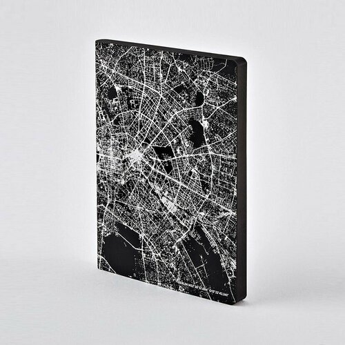 Блокнот Nightflight Light Berlin в обложке из гладкой матовой переработанной кожи чёрного цвета c изображением карты Берлина, представлен в размере L. Страницы выполнены из бумаги премиального качества плотностью 120 г с чёрным обрезом.