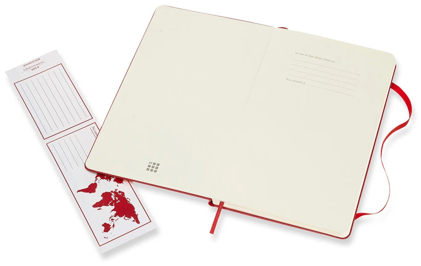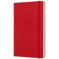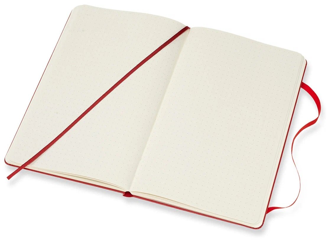 У блокнота Moleskine Classic Large твердая обложка красного цвета. Страницы с разлиновкой в пунктир (точка). Размер блокнота 130х210мм. Всего 240 страниц. Есть фиксирующая резинка и эластичная застежка, закладка. Вместительный кармашек убережет от потери визиток, записок и других мелких деталей.