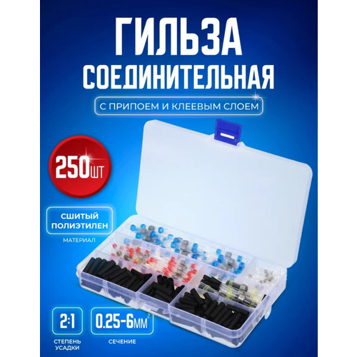 **Соединитель термоусаживаемый Bluestar GST250B под пайку предназначен для соединения медных многопроволочных проводов внахлест или встык методом термообработки. В середине соединителя располагается гильза из низкотемпературного припоя оловянно-свинцовой группы. С обеих сторон на внутренней поверхности термоусаживаемой трубки располагаются клеевые полосы, обеспечивающие герметичность соединения после усадки. Независимо от того, работаете ли вы на своей лодке, транспортном средстве, домашнем или промышленном объекте, наши термоусадочные паяльные и уплотнительные соединители обеспечат плотную пайку, повышенный ток и всепогодные соединения каждый раз.****Комплектация: черный (не водонепроницаемый) - 150 шт, красный - 35 шт, синий - 30 шт, белый - 25 шт, жёлтый - 10 шт, кейс для хранения. Покупатели находят нас по фразам: клеммник / клеммники / термоусадочная трубка / клеммы для проводов / припой для пайки / термоусадка / изолента / термокембрик / гильза соединительная / клеммы для пайки**Набор термоусаживаемых соединителей STAREX состоит из 250 термотрубок с припоем и клеевым слоем и предназначен для соединения медных многопроволочных проводов внахлест или встык методом термообработки.