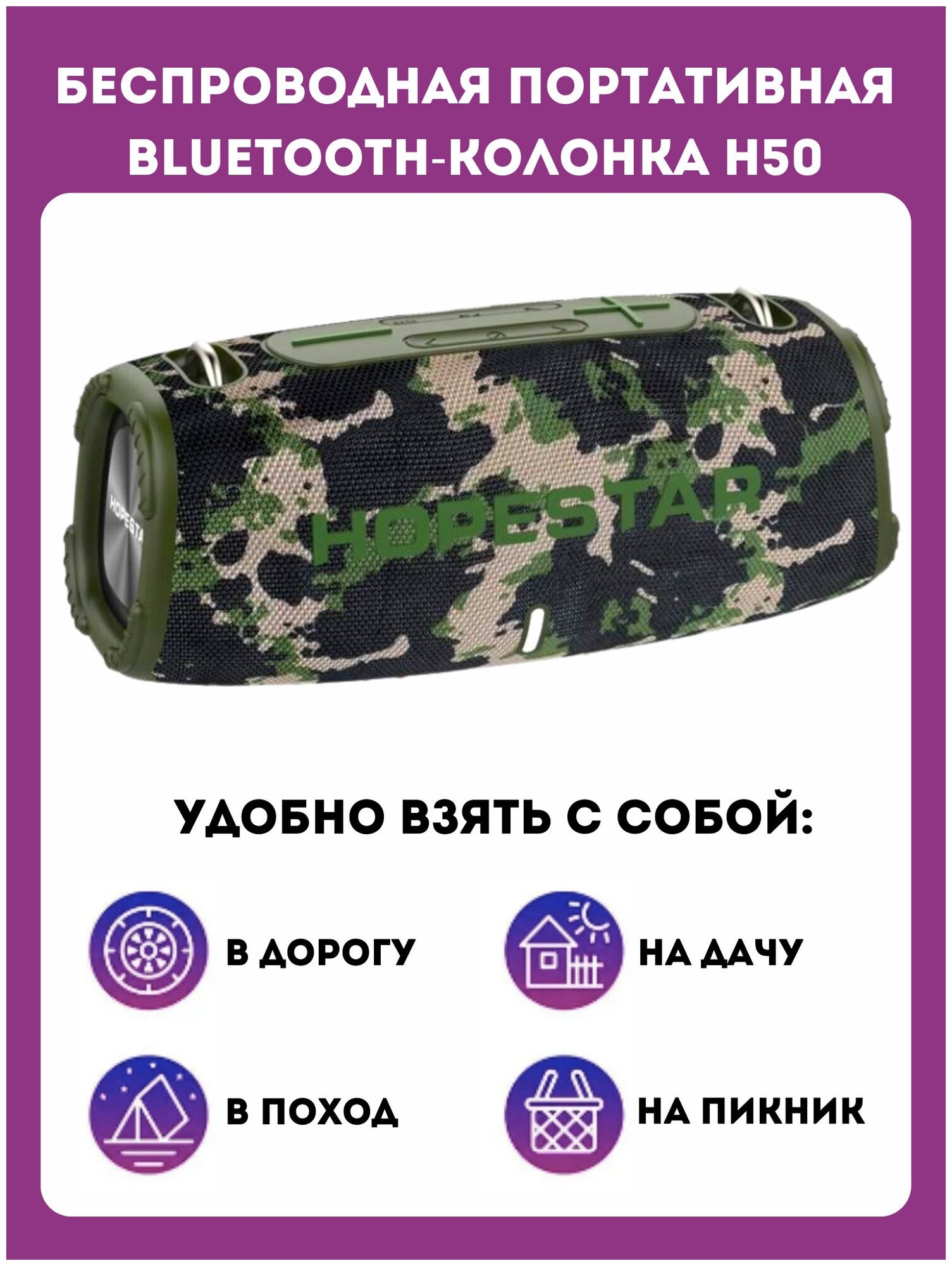Портативная колонка Hopestar H50 - это стильная и мощная новинка от бренда качественных колонок Bluetooth с великолепным, насыщенным звучанием. Её корпус выполнен из прочного пластика с Soft Touch покрытием, а лицевая часть и динамики надежно защищены сеткой, а кнопки управления прорезинены и нажимаются с отчетливым кликом. В задней части акустика имеет скрытые герметичной заглушкой разъемы USB, USB Type-c, TF, AUX. Сверху бумбокса расположены прочные металлические петли под ремень (для подвеса или ношения), качественный ремень входит в комплект. Колонка имеет пыле и влаго защиту IPX6, от любых погодных воздействий (водяные потоки или сильные струи с любого направления, брызги, дождь, пыль). Устойчивость на поверхности обеспечивает прорезиненное основание, которое предотвращает скольжение по поверхности. Cборка и материалы в устройстве - на самом высоком уровне, все контактные разъемы надежно и герметично защищены, поэтому, герметичная и ударопрочная колонка Hopestar H50 отлично подходит для использования под открытым небом. Hopestar H50 создает реалистичный и детализированный звук, передавая все нюансы музыкальных композиций. По бокам 2 пассивных излучателя, дополняющих и без того отличное звучание дополнительным объемом и глубокими басами. В колонке установлен новейший чип Bluetooth 5.0 и реализована функция беспроводного подключения 2-х колонок к одному мобильному телефону в стереопару. USB разъём используется для воспроизведения с флешек и для зарядки других устройств. Колонка оснащена мощным встроенным аккумулятором на 3000 мАч, в случае необходимости она с легкостью поделится зарядкой с Вашим устройством, тем самым заменит Вам Power Bank. На выбор представлено шесть стильных расцветок. Особенности: - Удобное кнопочное управление на верхней части корпуса - Использование передового чипа Bluetooth 5.0 аудио декодирования, поддержка всех Bluetooth устройств - Невероятно мощное, мягкое, наполненное плотным басом, отчетливое, чистое, громкое и объемное звучание - Поддержка функции TWS позволит объединить две колонки в одну стерео систему - Поддержка TF карты и USB флешек до 32 Гб, в формате: MP3/WAV/WMA/FLAC/APE - Функция FM-радио приемника - Функция Power Bank для экстренной зарядки смартфона и внешних устройств - Встроенный микрофон для громкой связи ● Сертификация: CE, ROHS, FCC ● Беспроводной протокол: Bluetooth V5.0 + EDR, L2CAP/A2DP (AVCTP/AVDTP/AVRCP) ● Беспроводная связь: до 10 м ● Динамики: Ф 66 мм*2 ● Встроенный сабвуфер (паcсивные боковые мембраны): Ф 66 мм *2 ● Выходная мощность: 20 Вт (10W/4Ω*2) ● Частотный диапазон: 100 Гц - 100 кГц ● Соотношение сигнал/шум SNR: ≥80dB ● Встроенный аккумулятор: Li-ion 18650, 3,7V, 3000 mAh ● Время работы: до 6 часов ● Зарядка: 3 часа, 5 V/1000 mA ● Материалы: ABS пластик, металл, резина, синтетическая ткань ● Степень влагозащиты: IPX6 ● Материалы: ABS пластик, металл, резина, синтетическая ткань ● Размер: 250 х 107 х 108 мм ● Вес: 1030 г